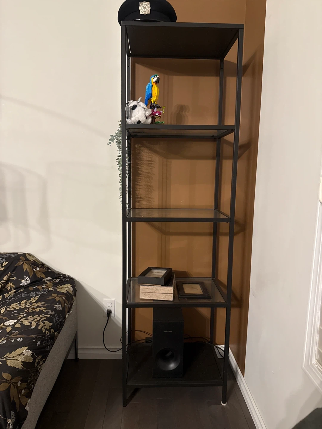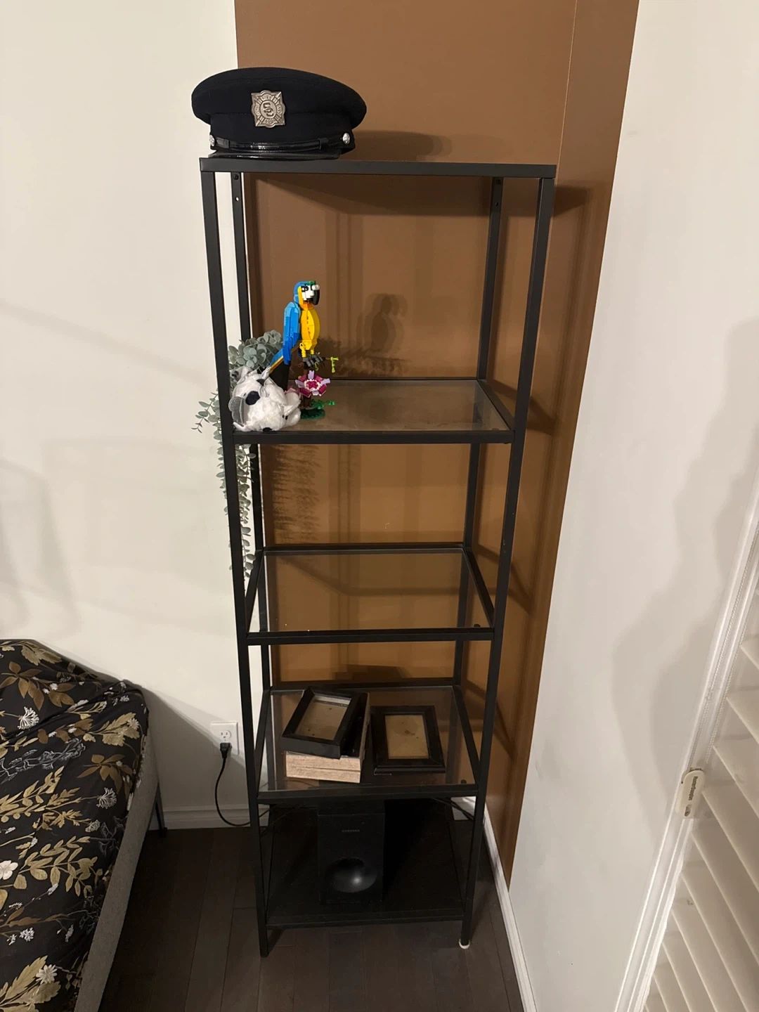 IKEA tall black metal shelf unit with glass shelves. It's in great condition and ready to add some style to your space!