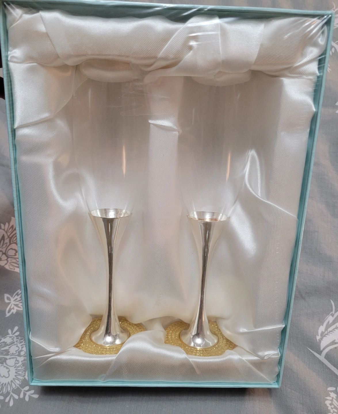 Pair of beautiful champagne flutes. Silver coloured stems and Gold speckled bases. Comes in a lovely gift box. Perfect for a wedding or special occasion.