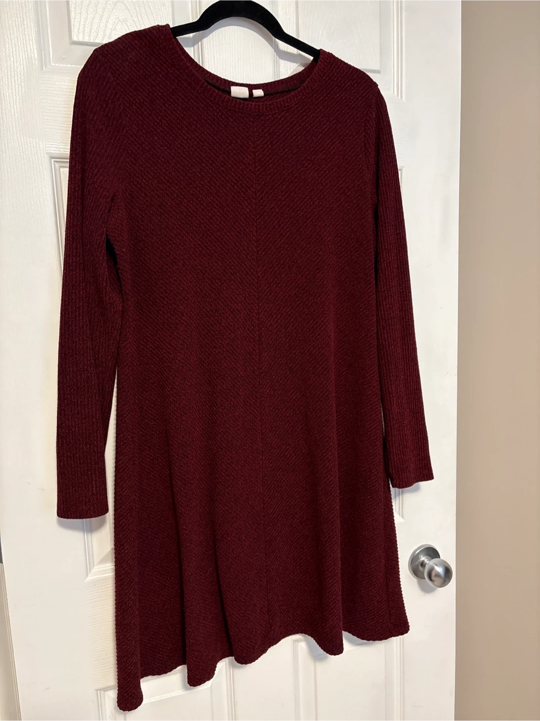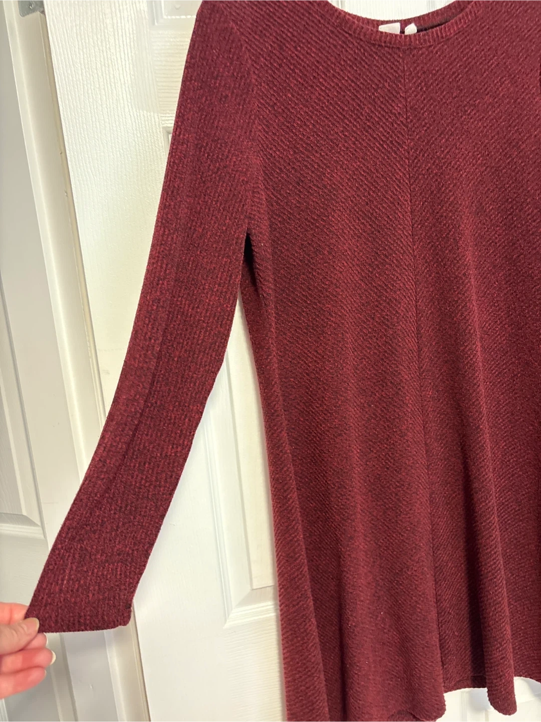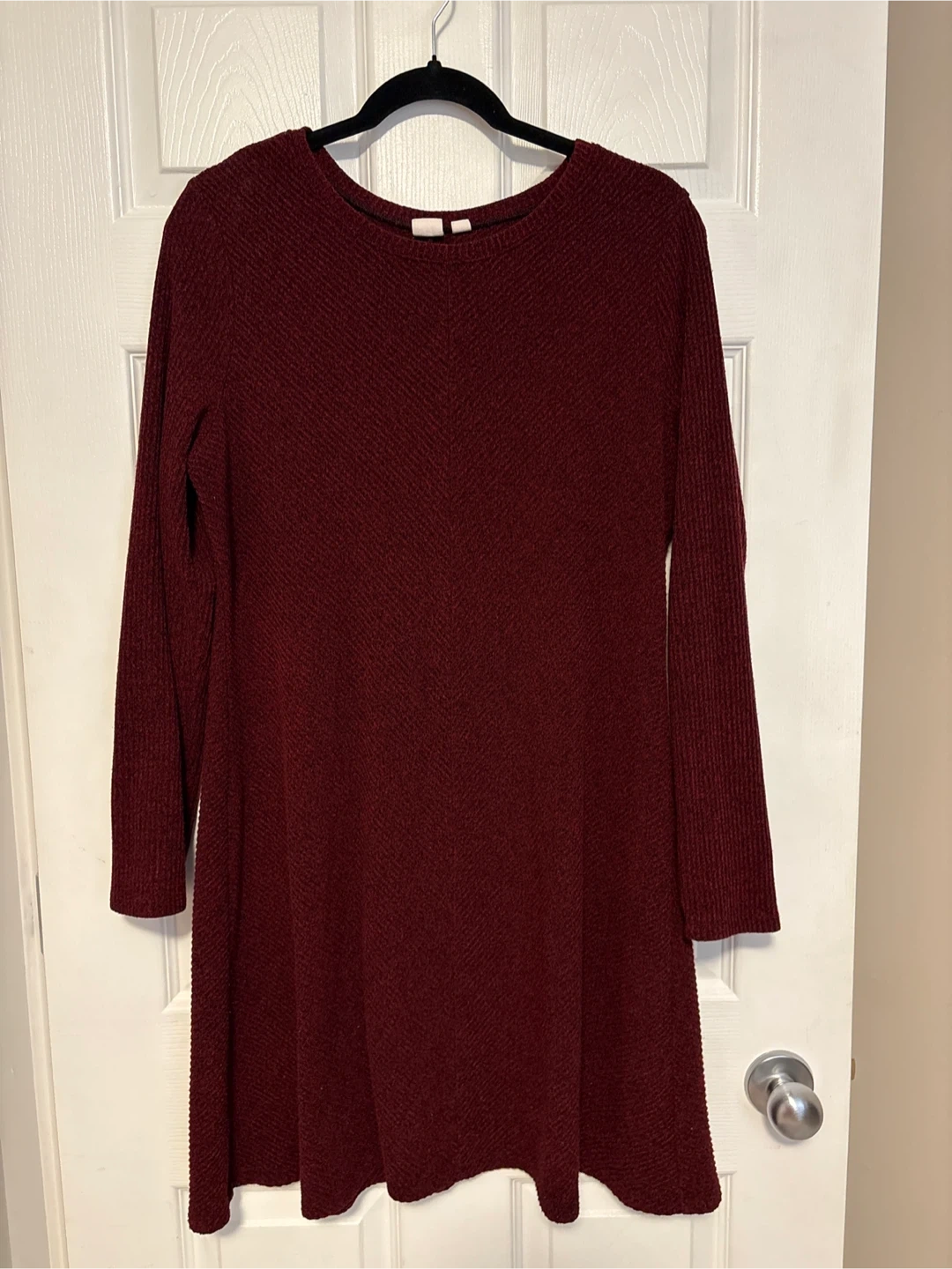 This is a GAP women's long-sleeve tunic dress in burgundy. It's a size XL. The fabric has a textured, ribbed pattern. It's made from a soft material.