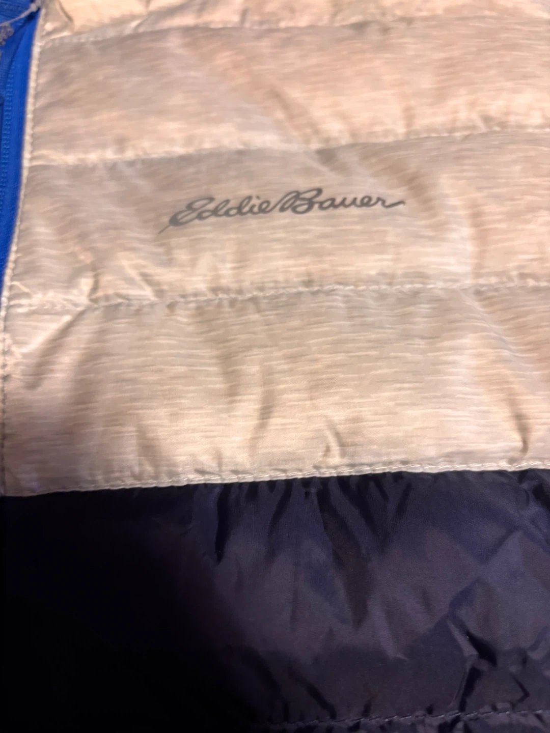 This is an Eddie Bauer Youth light Reversible Hooded Down Jacket. It's a gray/blue colorblock and size S/7-8. It's new