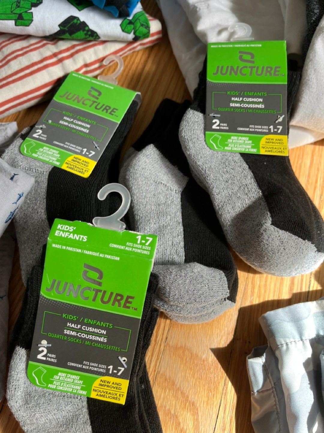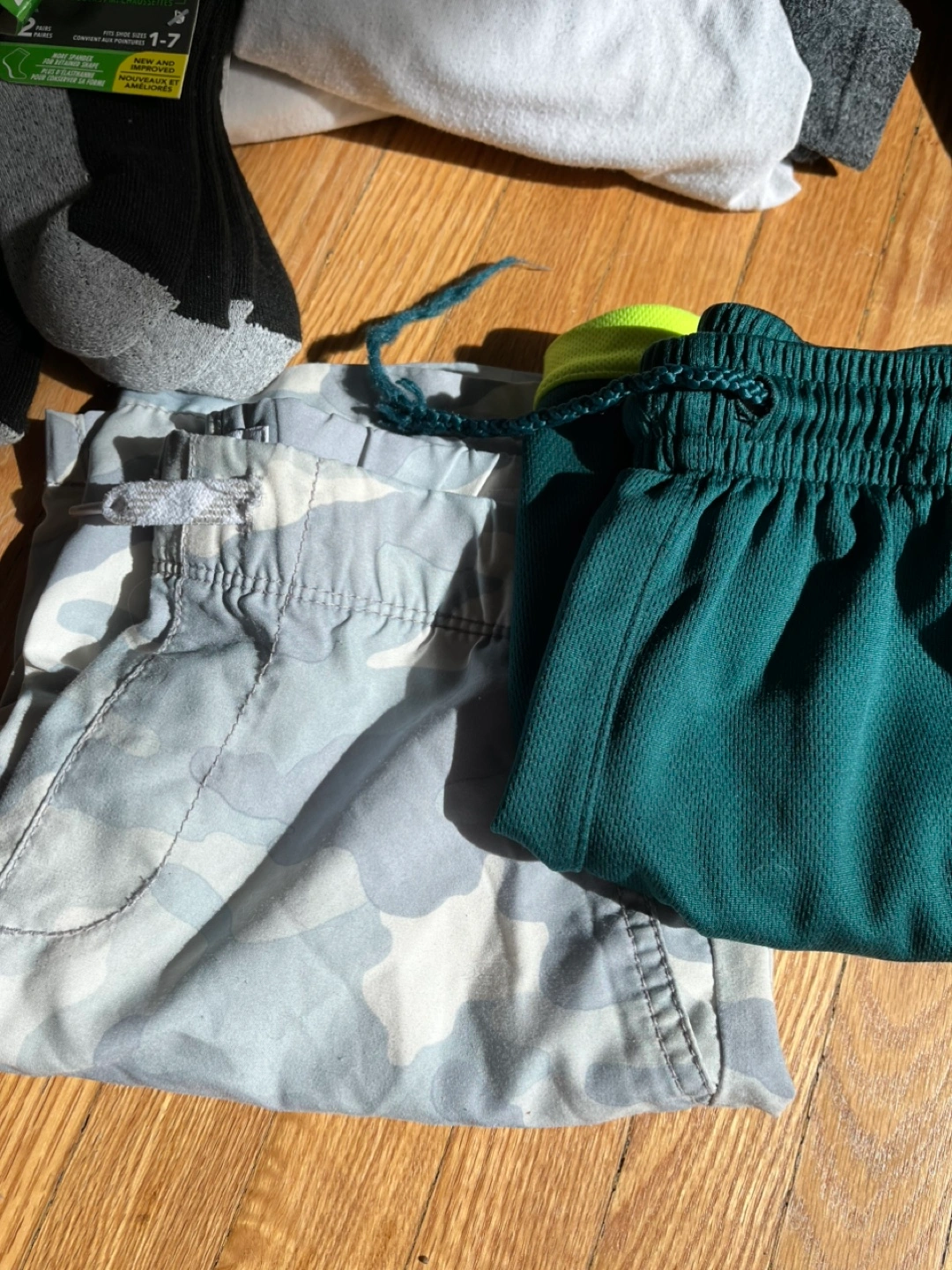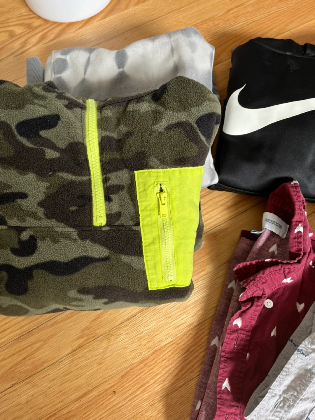 Bundle includes various boys' clothing items: 3 t-shirts, 2 long-sleeve shirts, 3 hoodies, and 2 shorts. Sizes vary. Also included are a pair of boys black dress shoes. Good condition.brand new socks ( bought wrong size