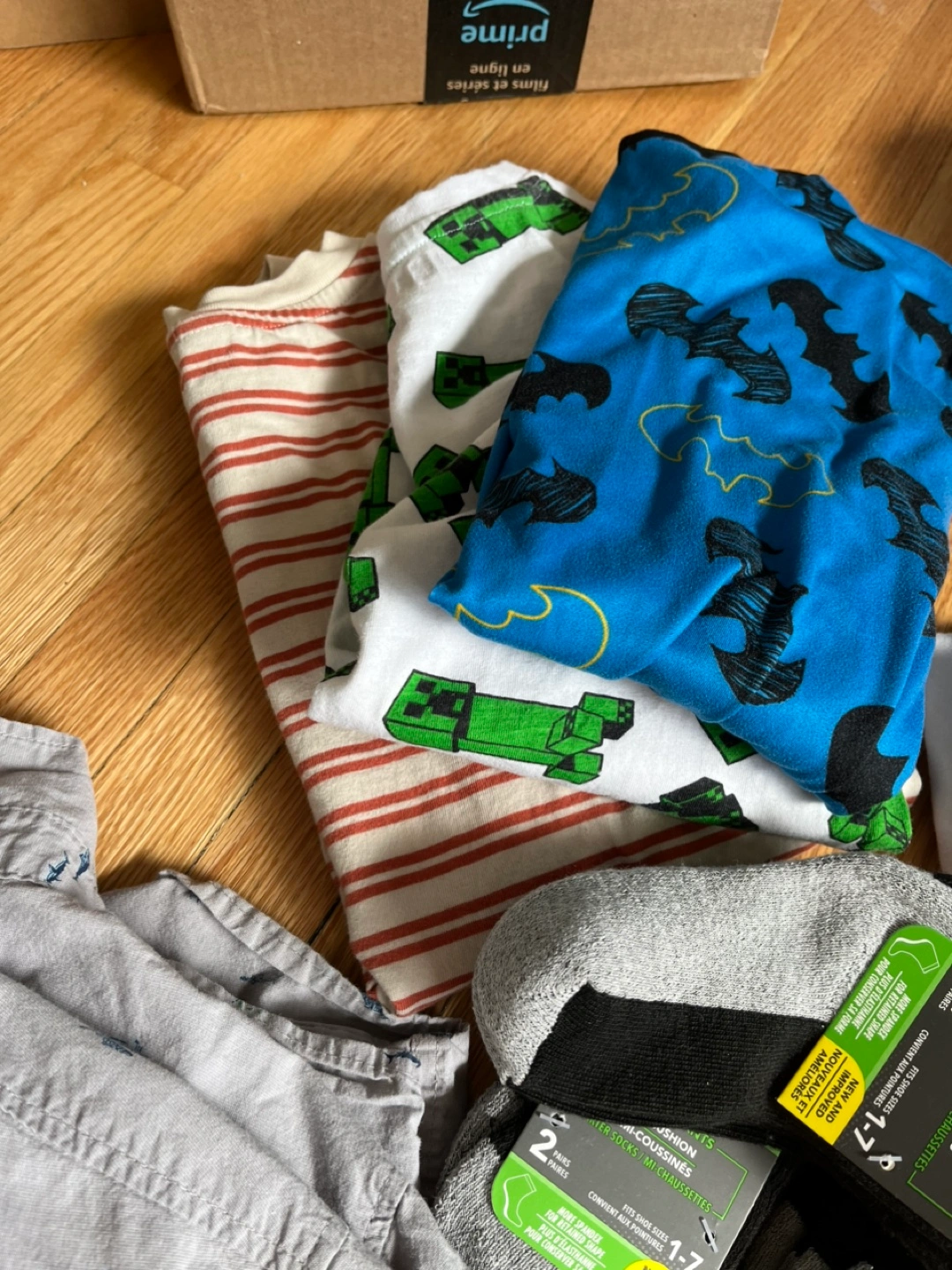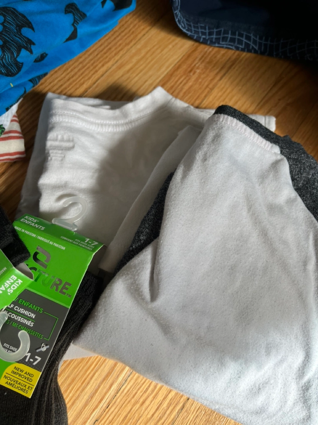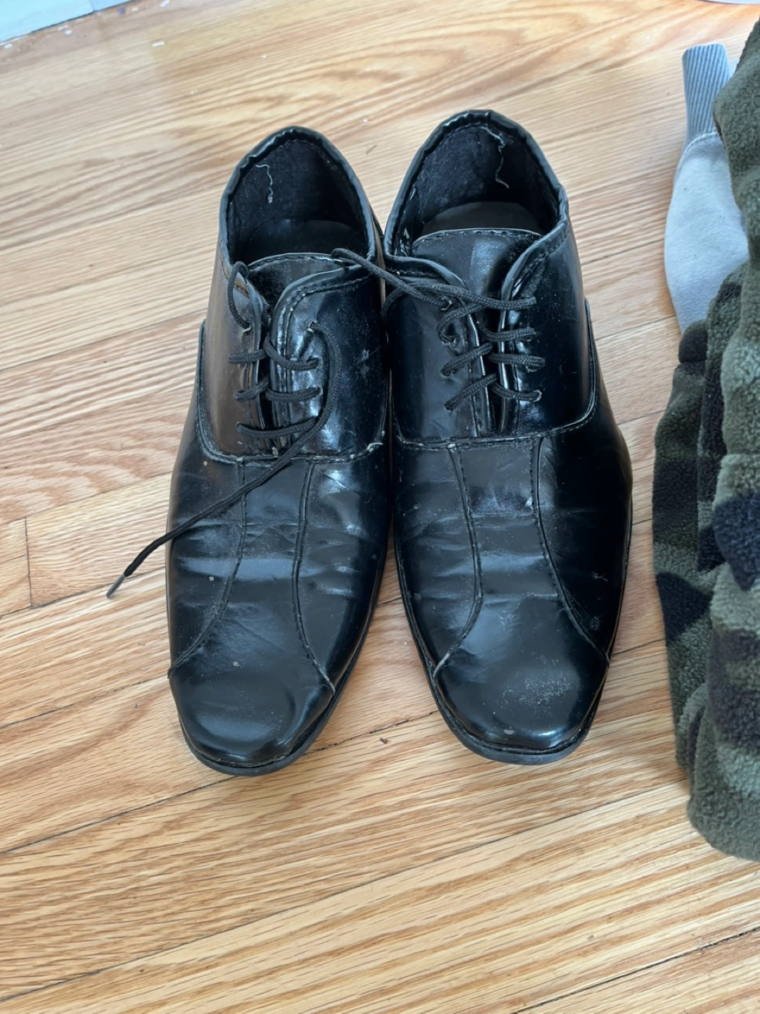 Bundle includes various boys' clothing items: 3 t-shirts, 2 long-sleeve shirts, 3 hoodies, and 2 shorts. Sizes vary. Also included are a pair of boys black dress shoes. Good condition.brand new socks ( bought wrong size
