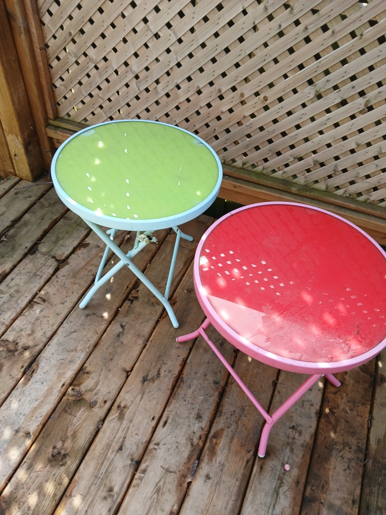 Two colourful, foldable side tables. Oval shape. Painted metal frames. Glass or plastic tops. Excellent for patio or balcony. some fading but in good shape. easy to store.