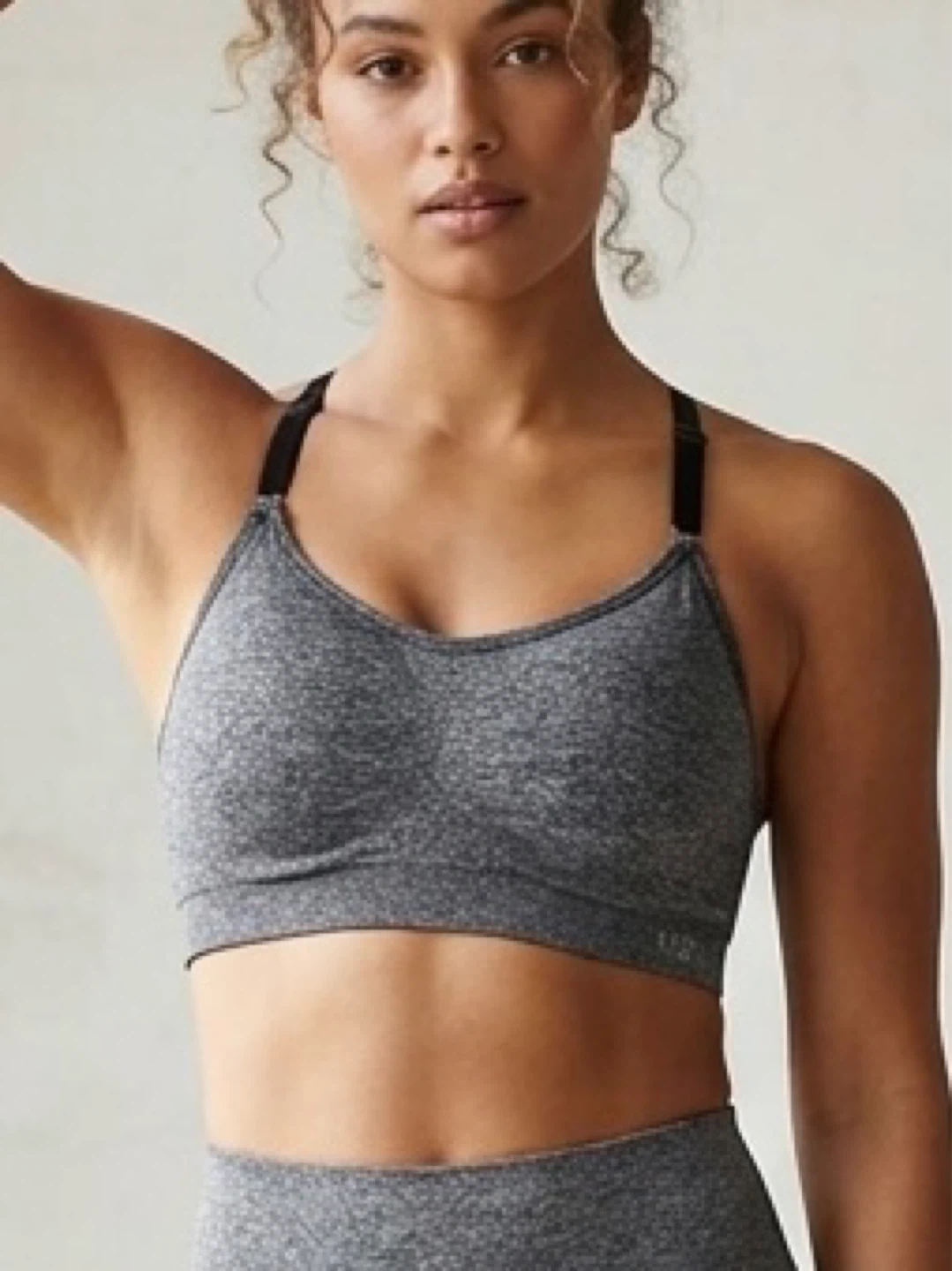 sports bra, seamless, racerback, gray, grey, charcoal, athleisure, gym, workout, medium