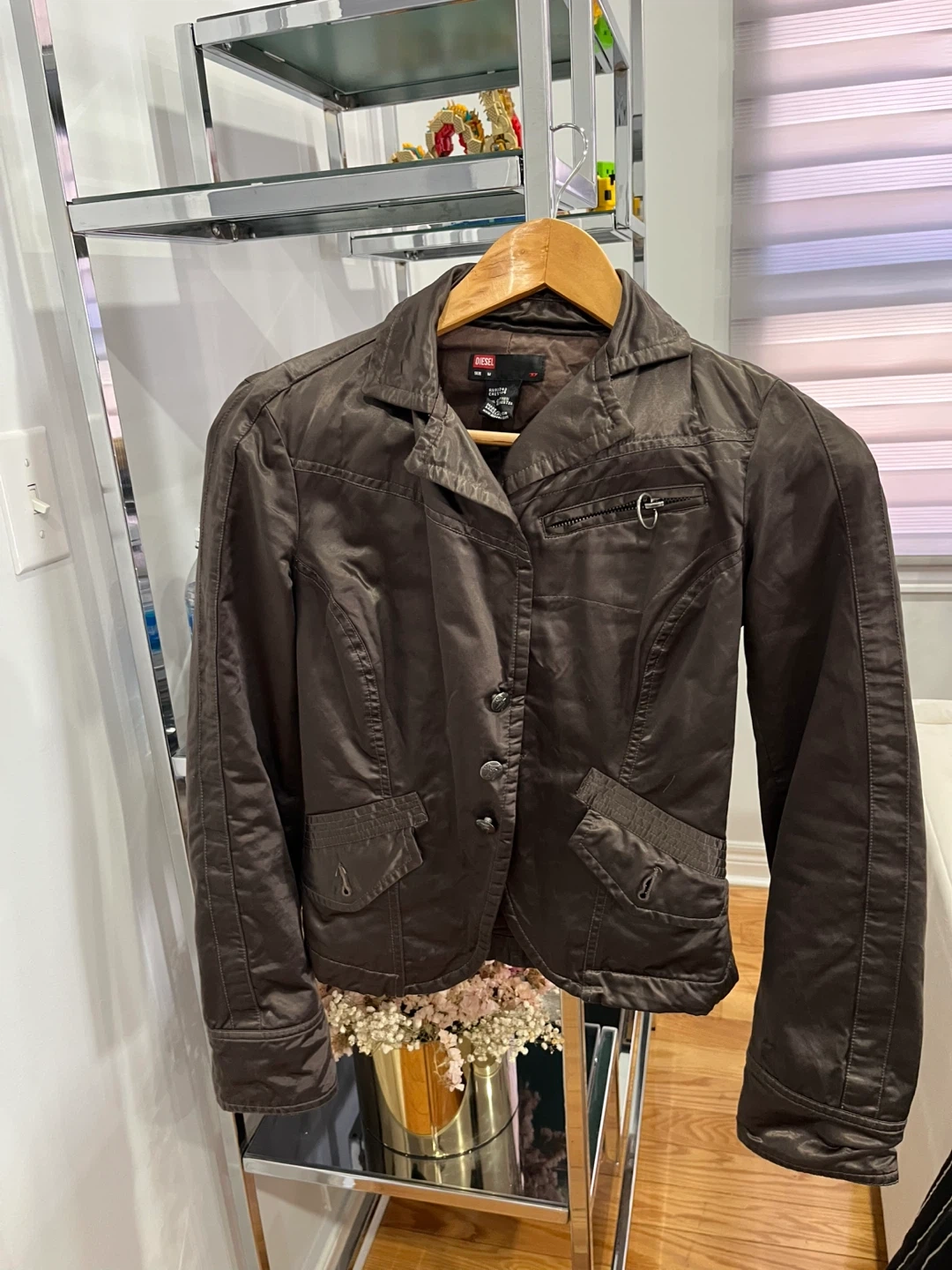 Diesel jacket in a size medium. It's made with 60% cotton and 40% polyester. Features a cool embroidered card design on the back!