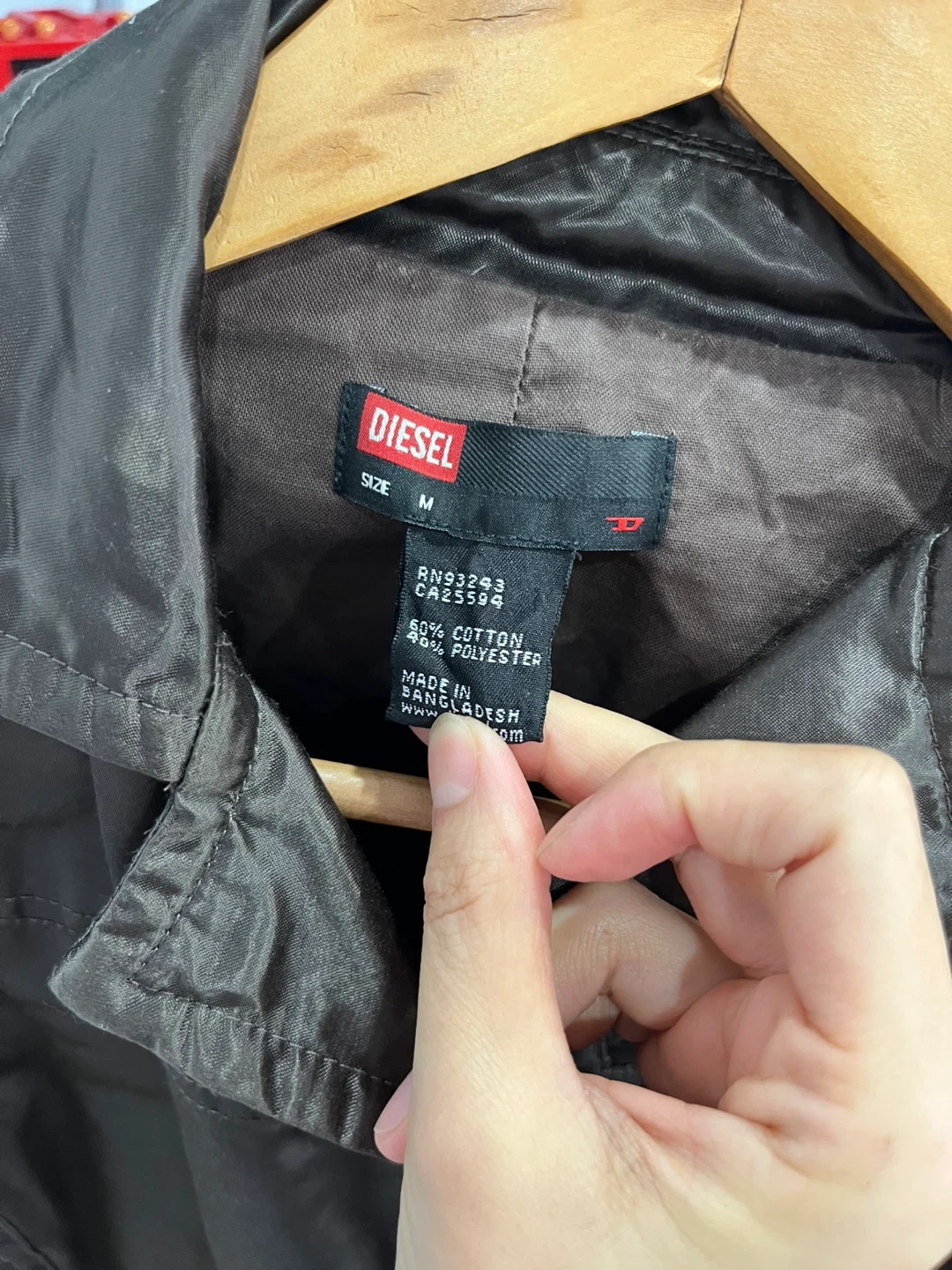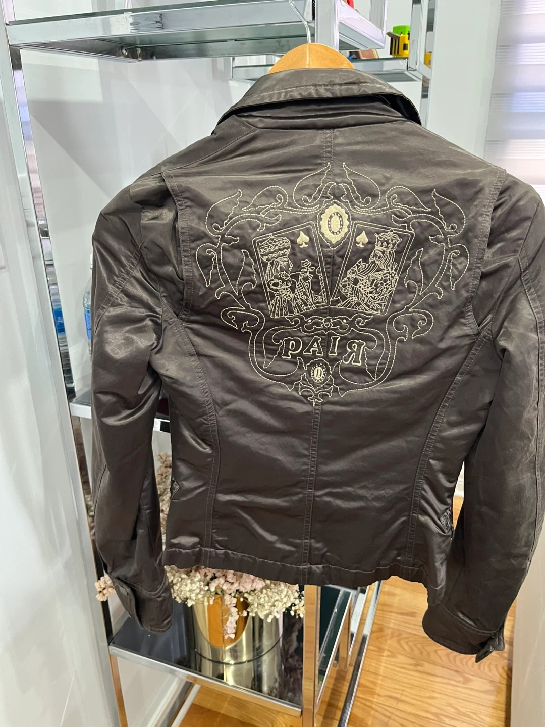 Diesel jacket in a size medium. It's made with 60% cotton and 40% polyester. Features a cool embroidered card design on the back!