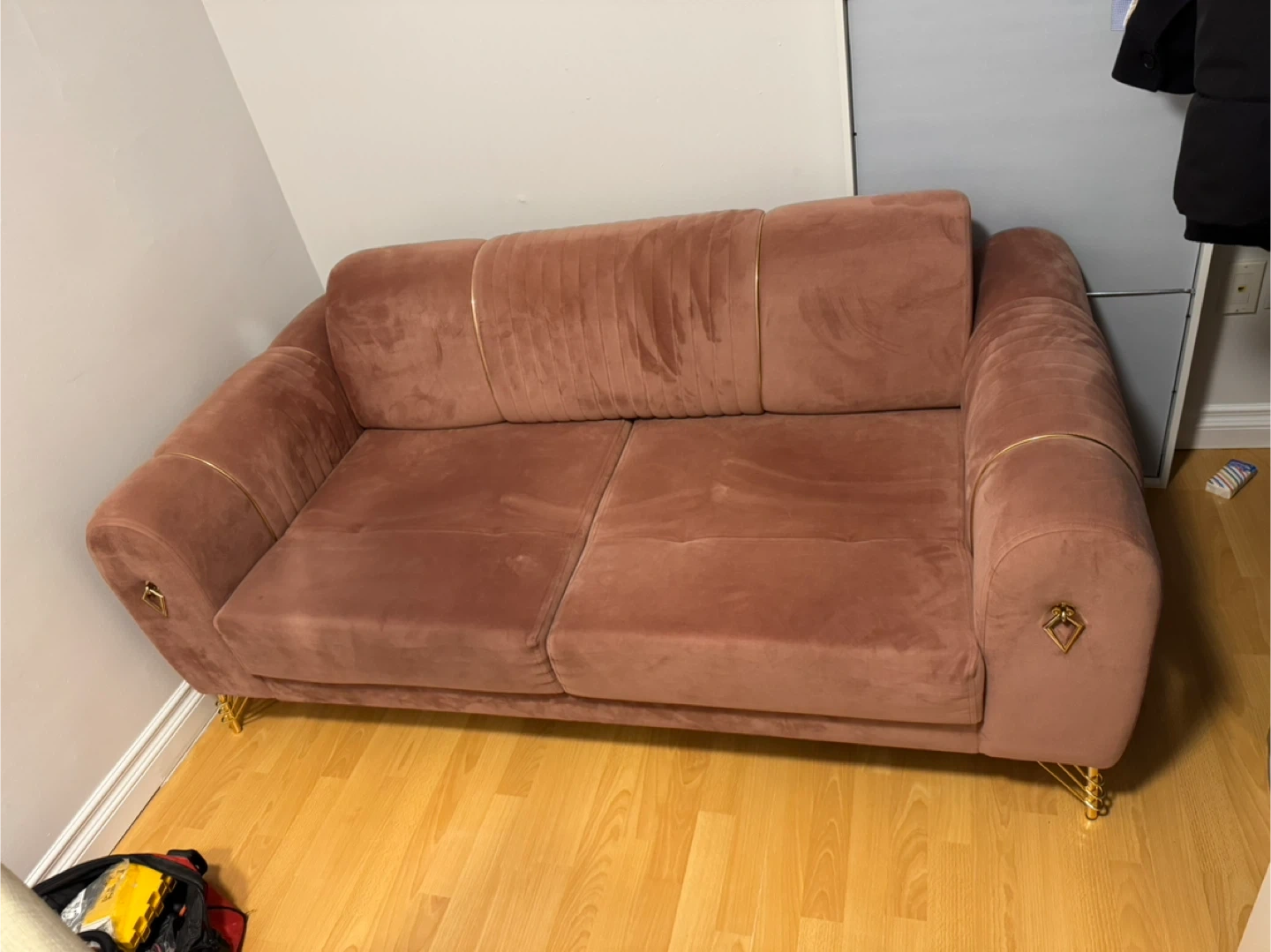 A lovely pink velvet loveseat sofa with tufted back cushions and gold trim accents. It's a comfortable two-seater that'll add a touch of elegance to any room. It hasn't been used much. It was purchased 1 year ago and used for 6 months. There was a house move 6 months ago so it didn't fit in the living room. It's very clean, spotless, undamaged and has no issues. dimensions width 90 cm ( 36 inches ), length 170 cm ( 67 inches )