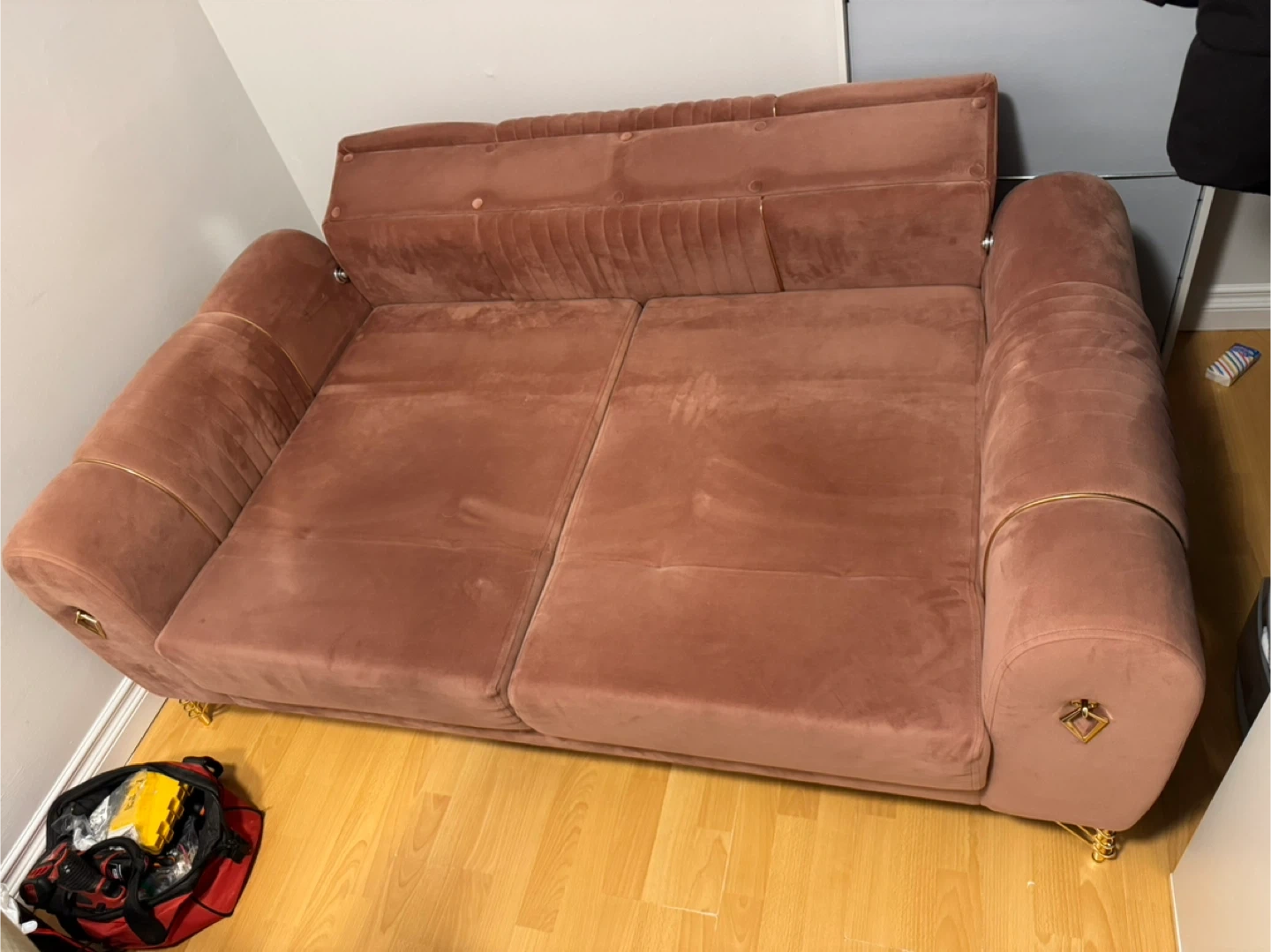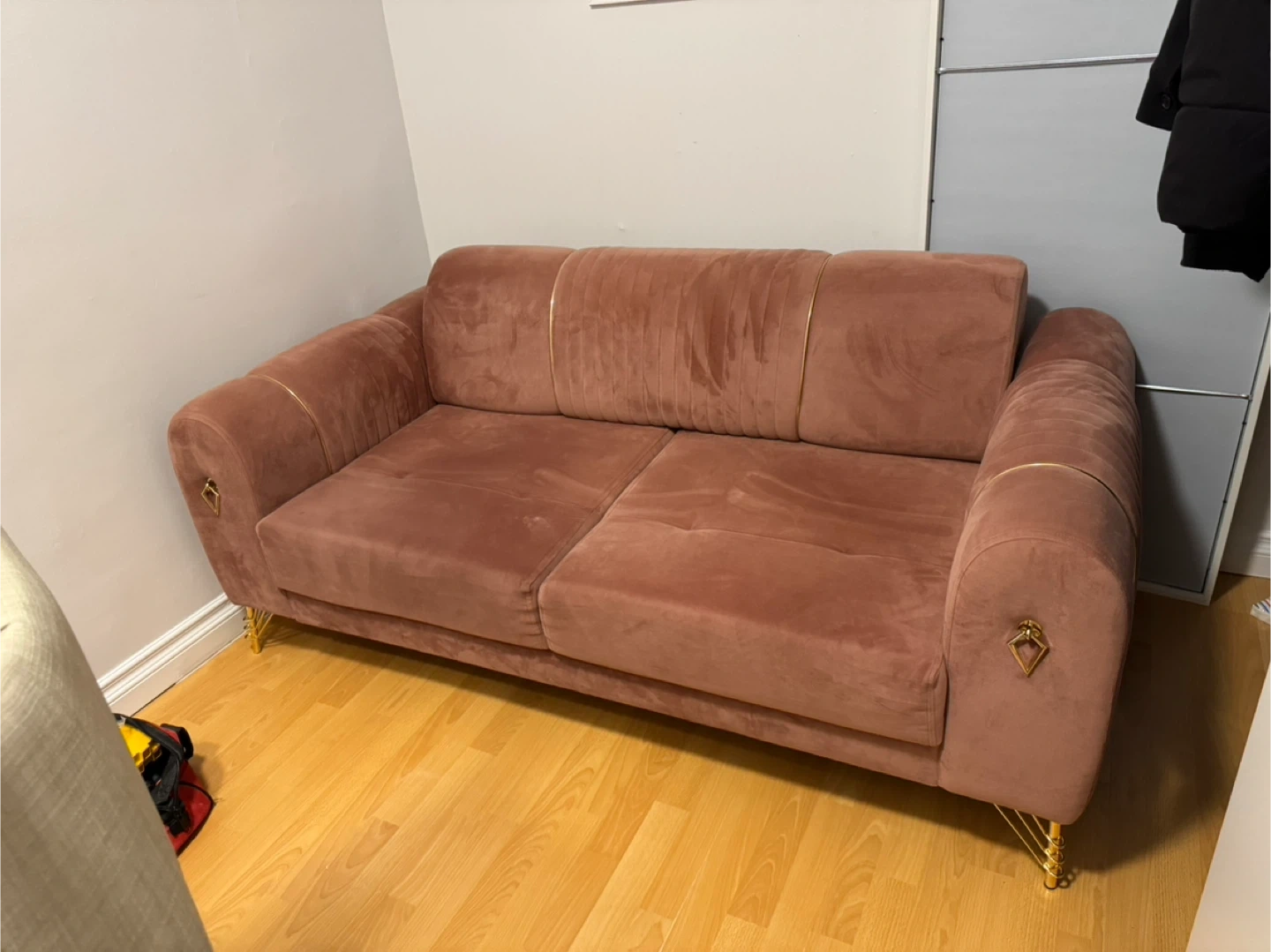 A lovely pink velvet loveseat sofa with tufted back cushions and gold trim accents. It's a comfortable two-seater that'll add a touch of elegance to any room. It hasn't been used much. It was purchased 1 year ago and used for 6 months. There was a house move 6 months ago so it didn't fit in the living room. It's very clean, spotless, undamaged and has no issues. dimensions width 90 cm ( 36 inches ), length 170 cm ( 67 inches )