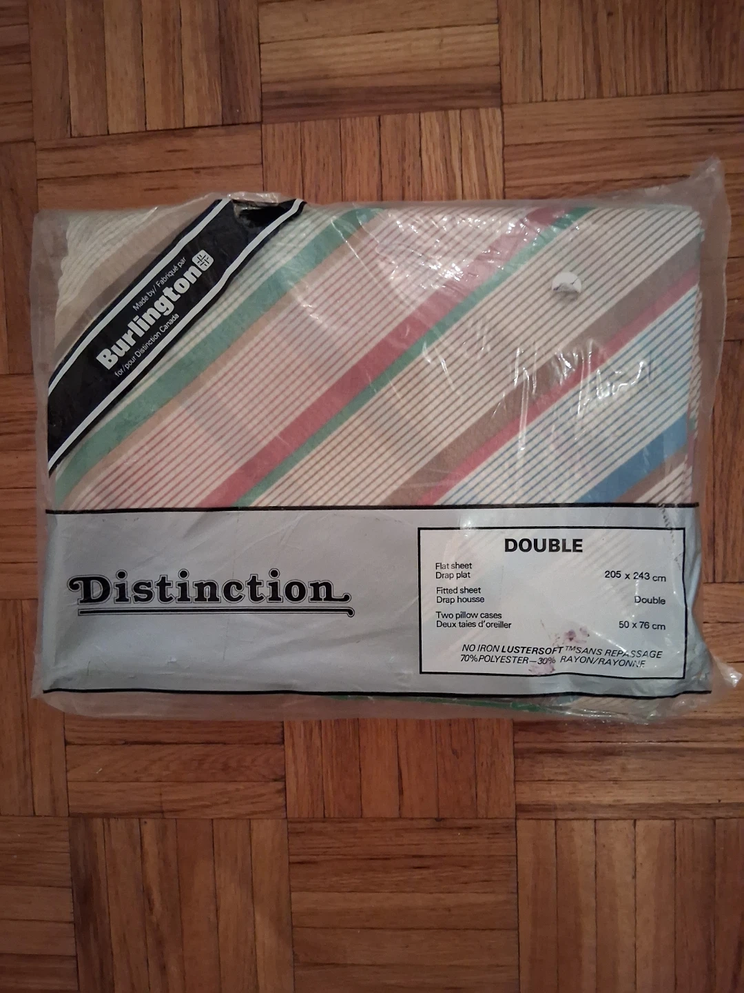 This is a double sheet set from Burlington's Distinction line. It includes one flat sheet (205 x 243 cm), one fitted sheet (Double), and two pillow cases (50 x 76 cm). The fabric is 70% Polyester and 30% Rayon, and it's no-iron Lustersoft. Great for updating your bedding!