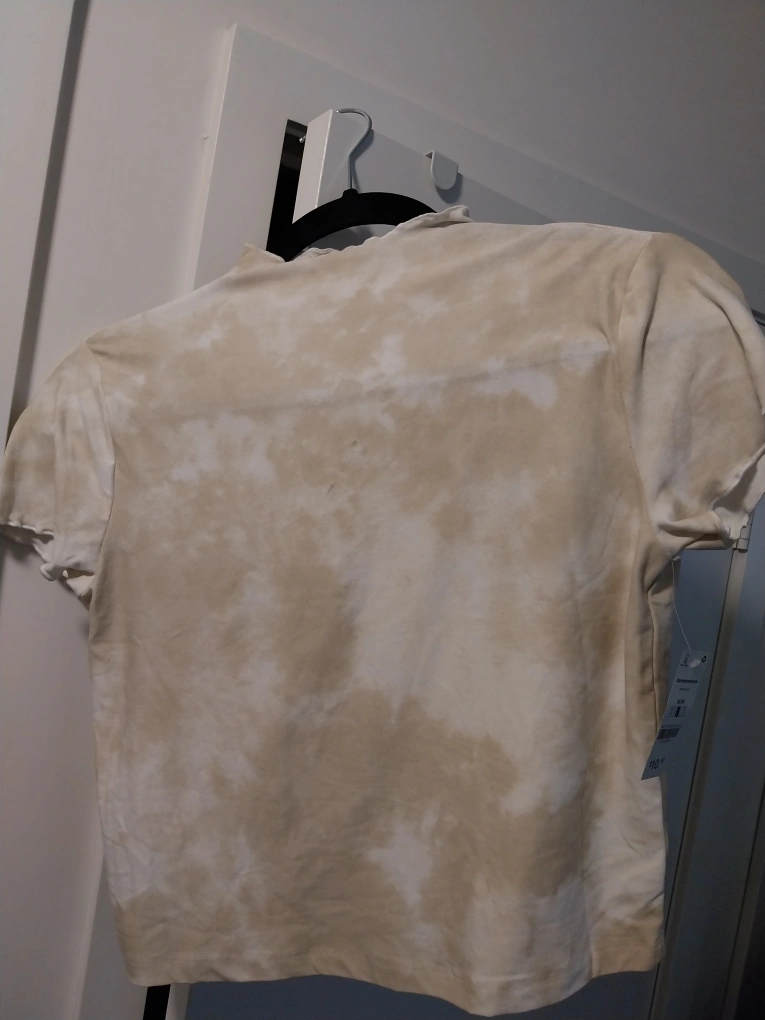 Short sleeve, pale yellow and white tie dye pattern, mock neck. Size M/M. NEW unworn with tag. original price $10.90 plus tax, selling at reduced price.