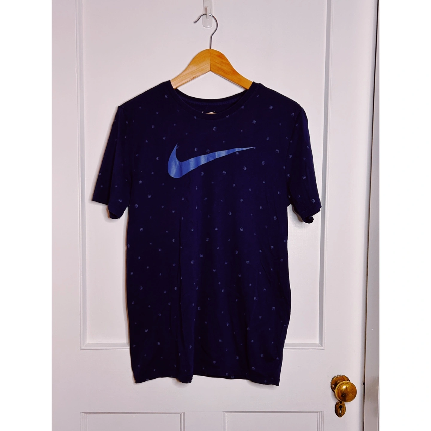 Navy blue T-shirt with a blue Nike swoosh and a small patterned basketball design. Short sleeves and a crew neck.