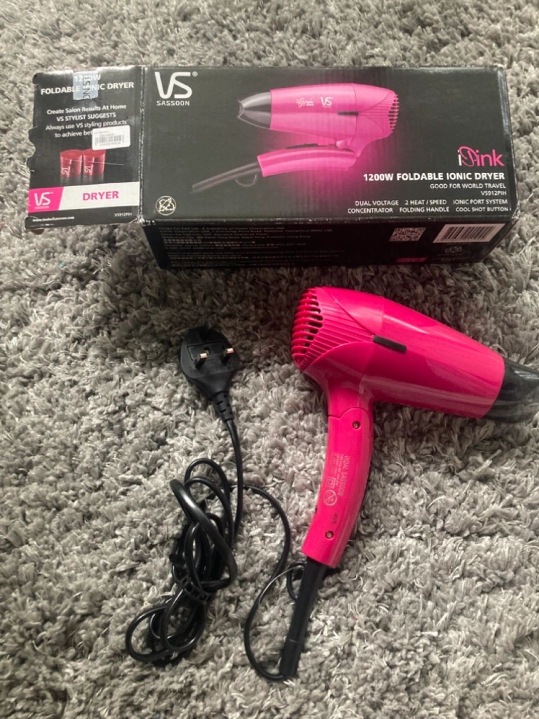 MUST pick up from Church and Wood street. I will only reply to messages if you indicate you can Pickup Saturday, before 4pm. Please include pickup time in your first message. Pink foldable hair dryer with dual voltage, two heat settings, and ionic system. Includes concentrator and folding handle.