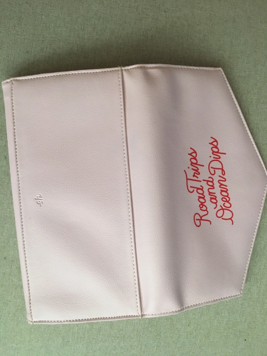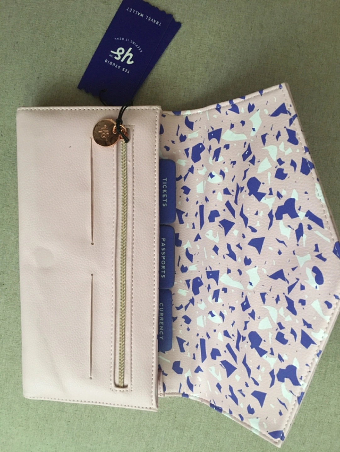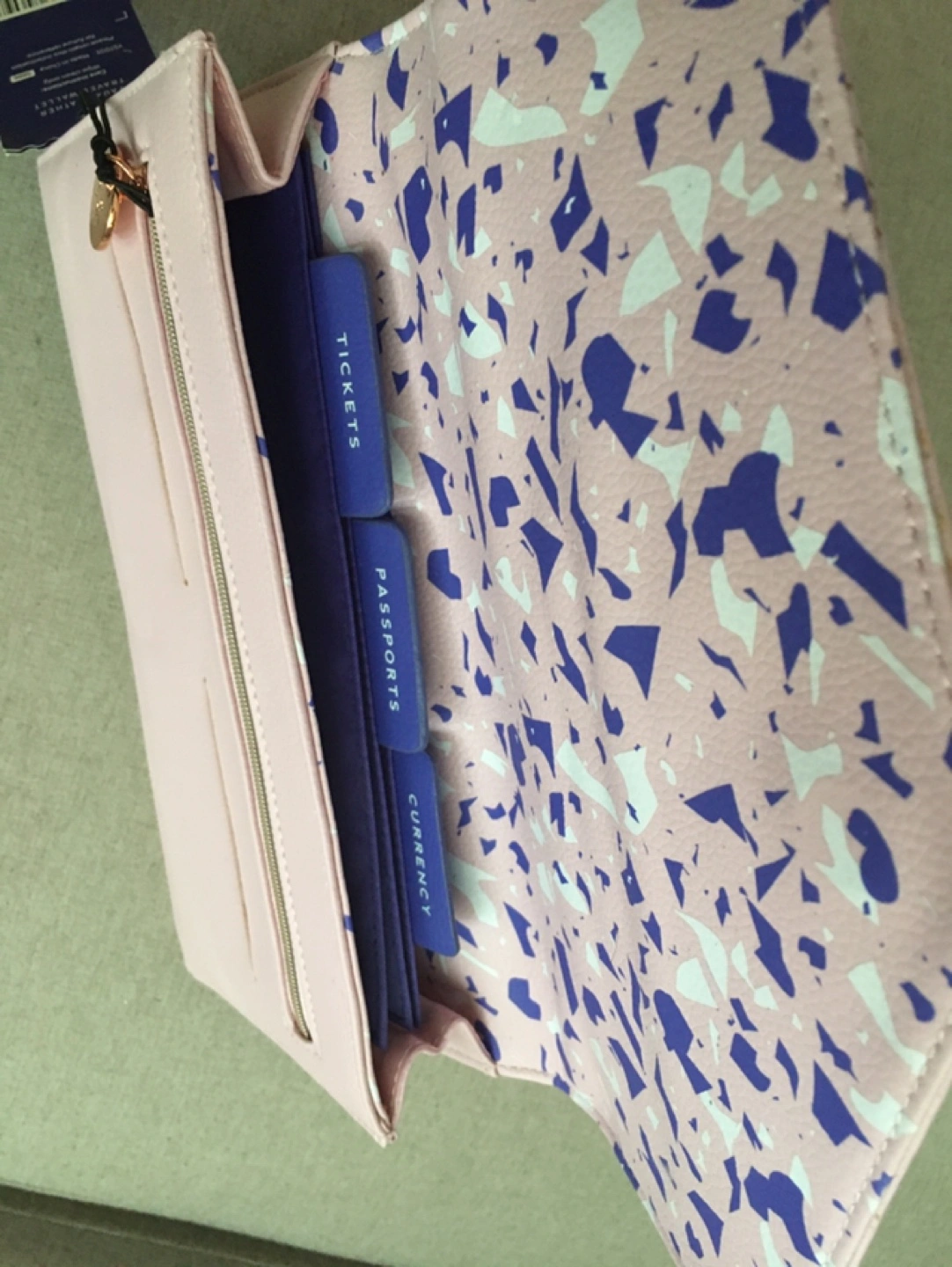Travel wallet, pink with blue and white interior, has multiple sections for tickets, passports, and currency. Includes zippered compartment