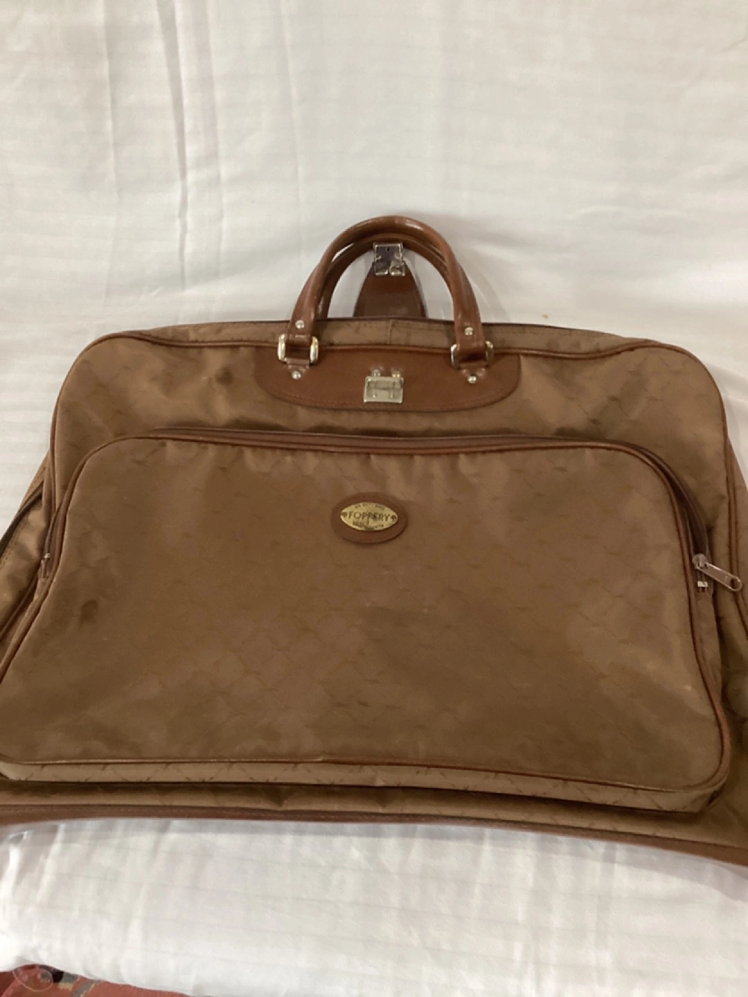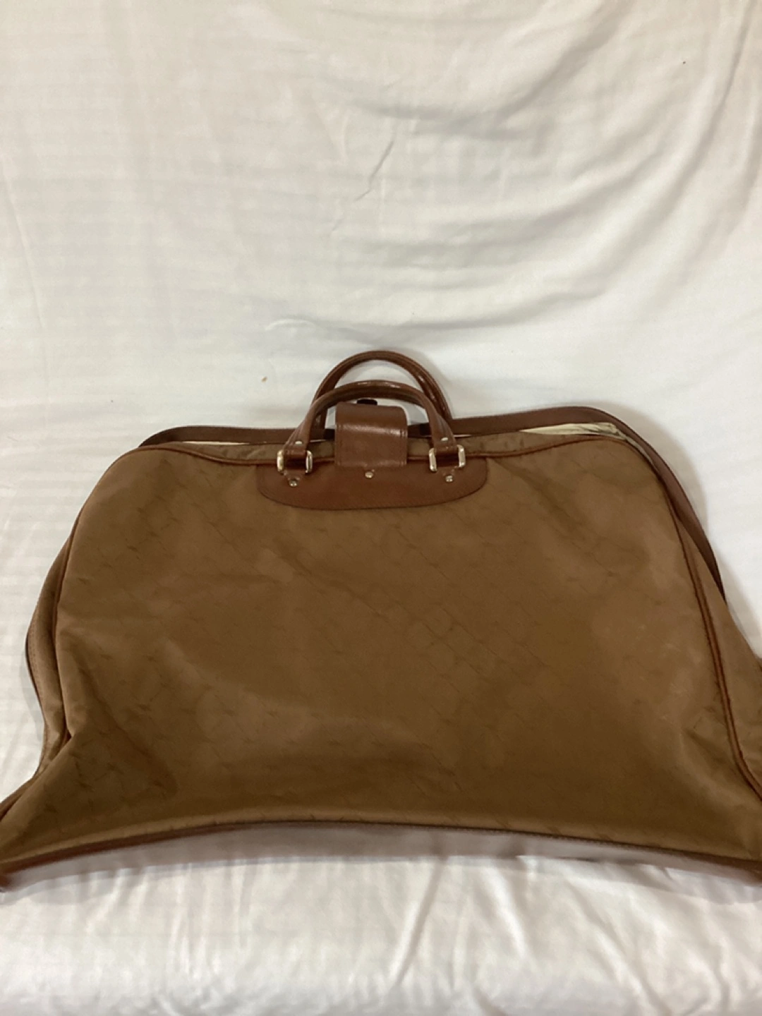 Brown garment bag for travelling open to reveal a brown quilted lining with an out side pocket on one side for document