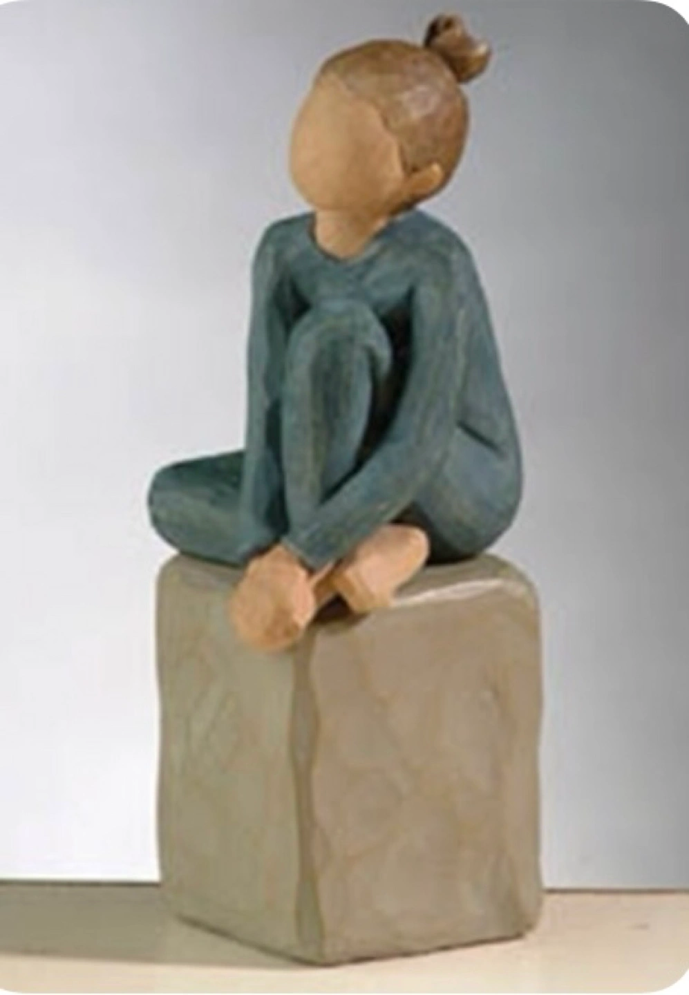 Small Willow Tree figurine of a girl sitting on a cube. The girl is wearing blue clothing and has brown hair.