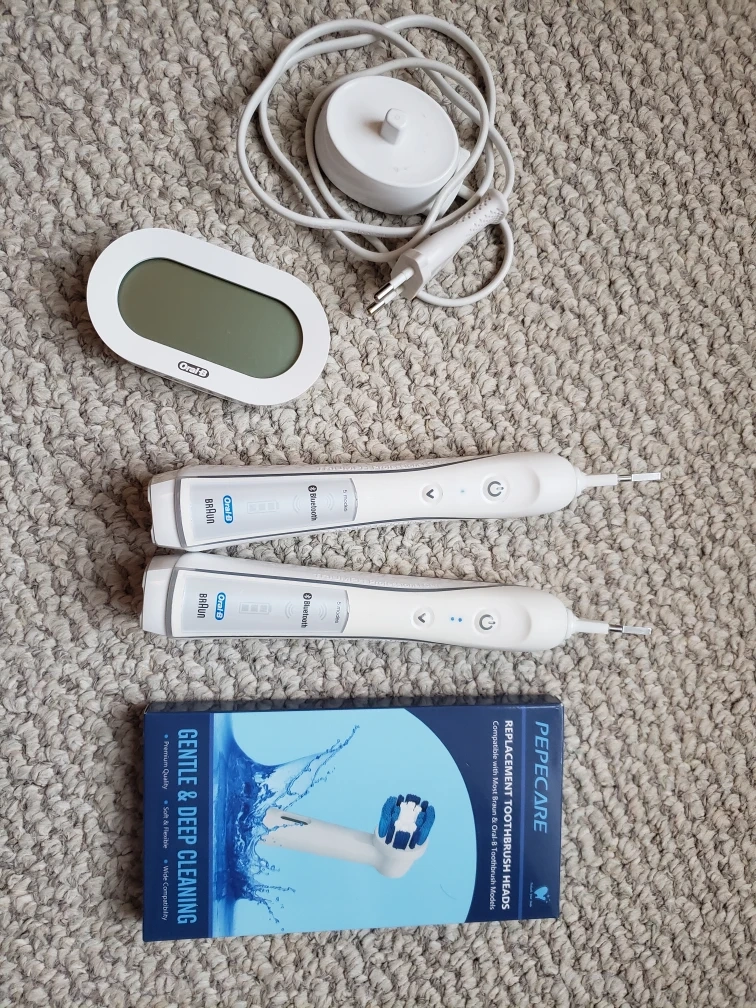 227Oral B electric toothbrushes (2) with replacement heads. 2 heads has already been used up. Note: the plug is EUROPEAN style!! But I've been using it here in Canada with a converter with no problem. There's also a mini device for showing the time and showing how much time elapsed when the toothbrush is in use. Comes without batteries. (it needs 2 AAA batteries)