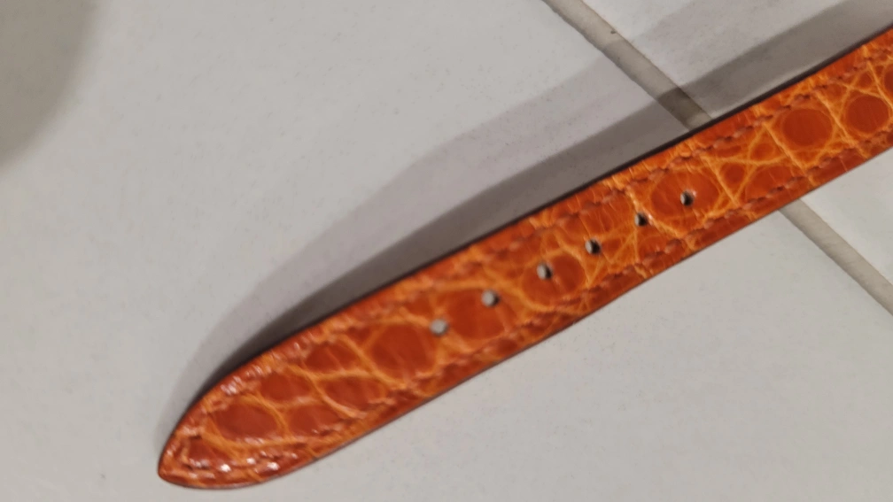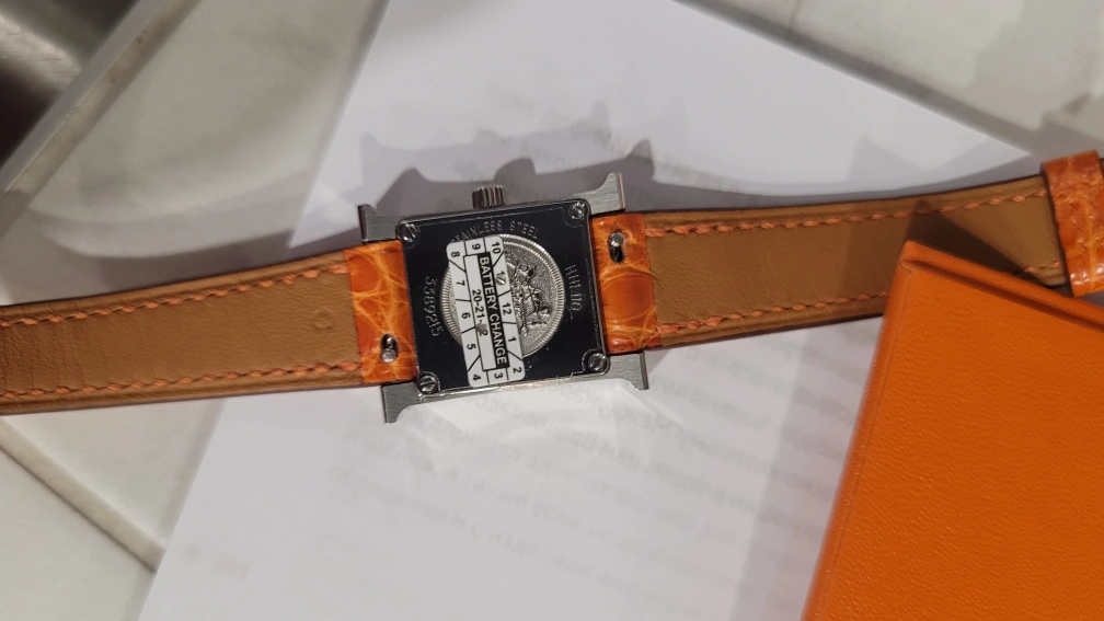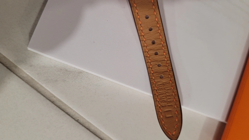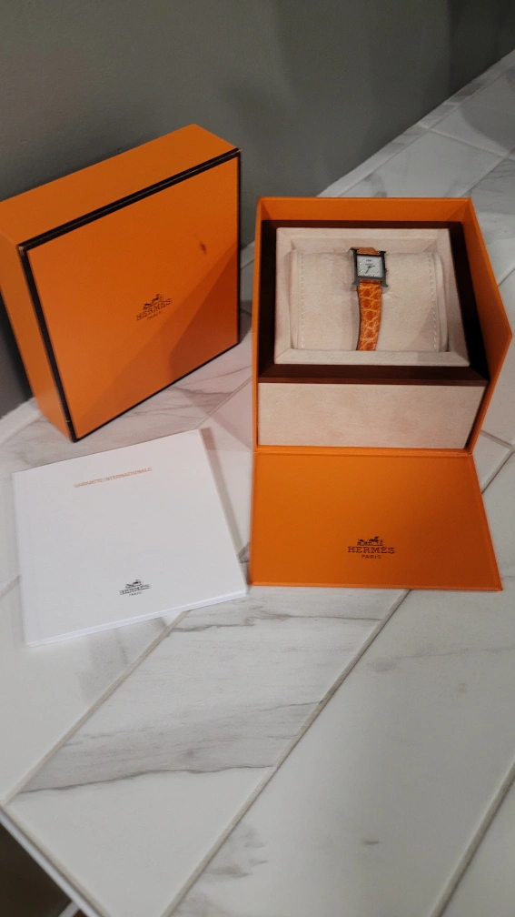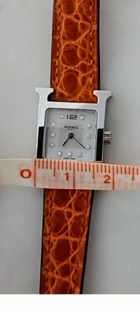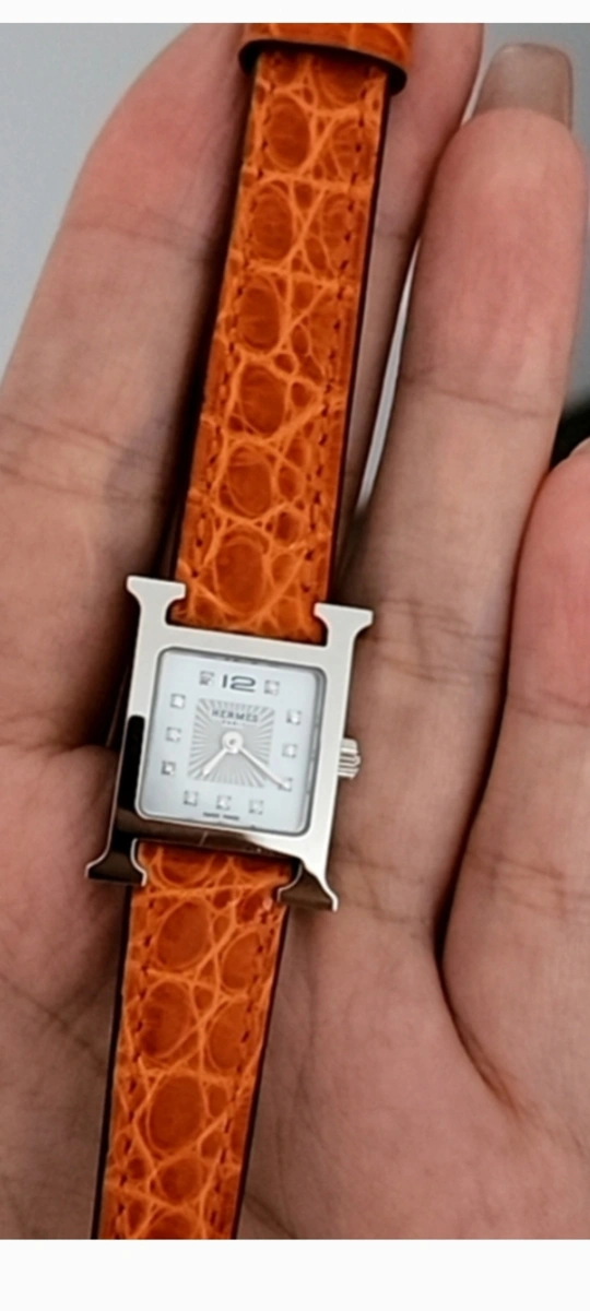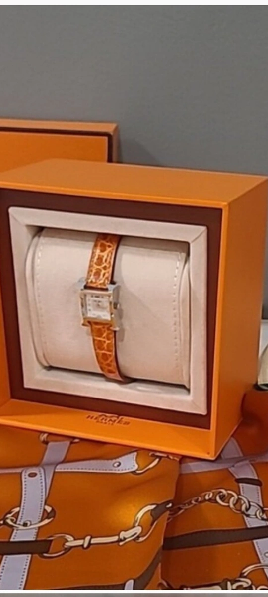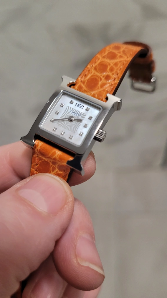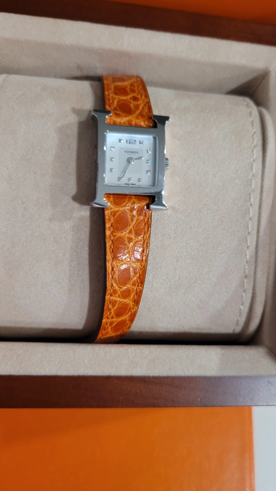 Authentic Hermes watch with orange leather strap and diamonds, pearl face.Comes with original box and authentication paperwork.