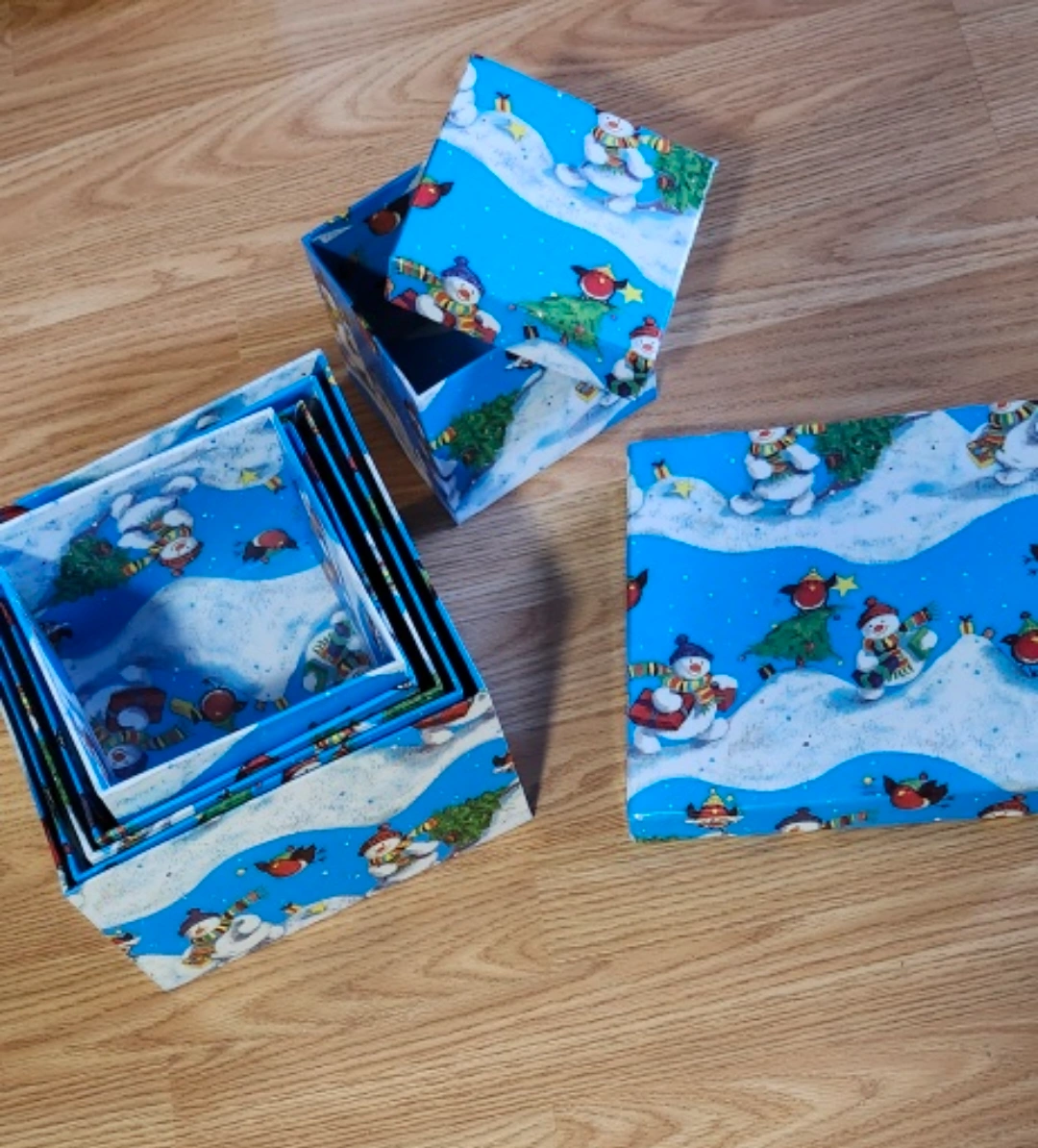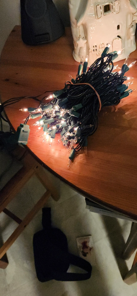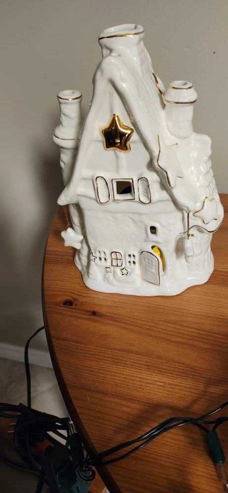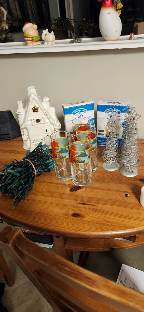 Set of approx 100 white Christmas lights. Two boxes of 50 white Christmas lights. Four Christmas glasses. White porcelain house. Two silver Christmas trees with coloured embellishments