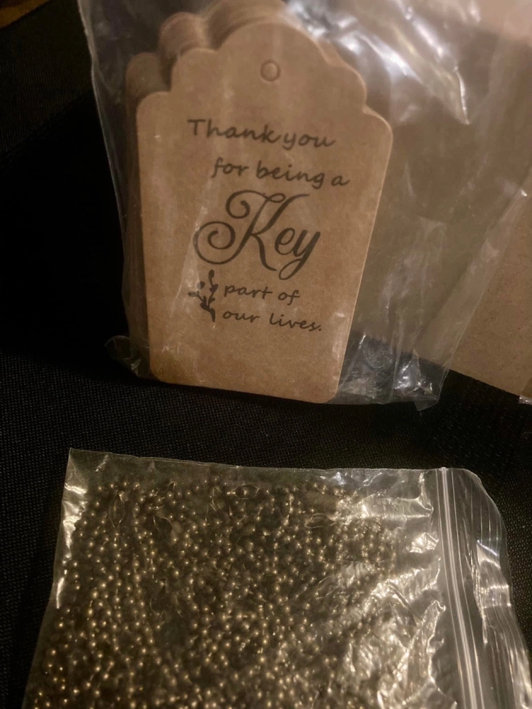 Set of key bottle openers, tags, and beads. Perfect for weddings. Brand new set of 28 key favours bottle openers with thank you tags & chains to attach for wedding etc , from a smoke-free home . Pick up In Woodstock , close to Fanshaw College.