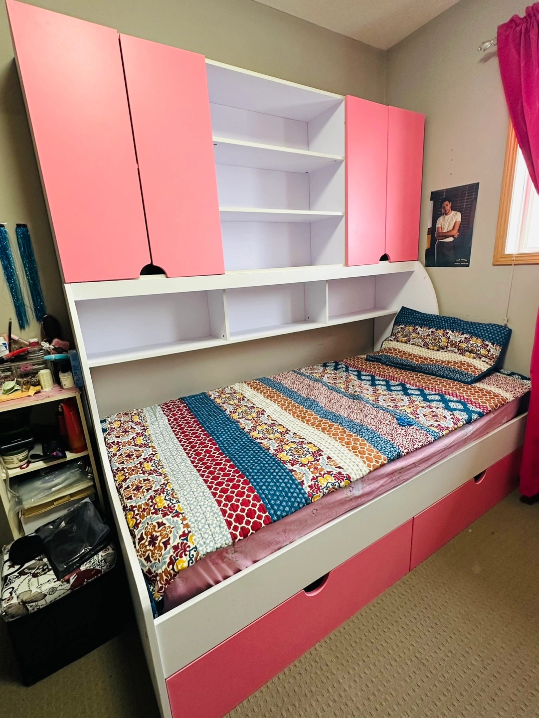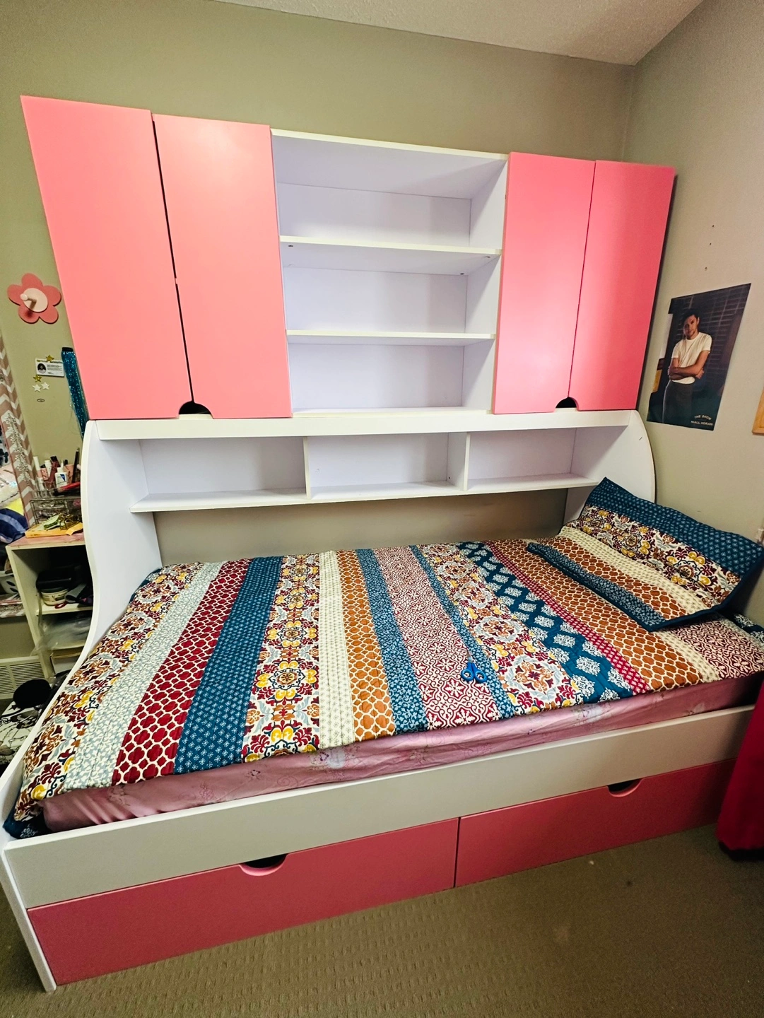 White and pink twin bed with two drawers and shelves. It includes two cabinets with doors. Mattress and bed sheet not included. All in great condition. No issue. Located at Taradale ne area