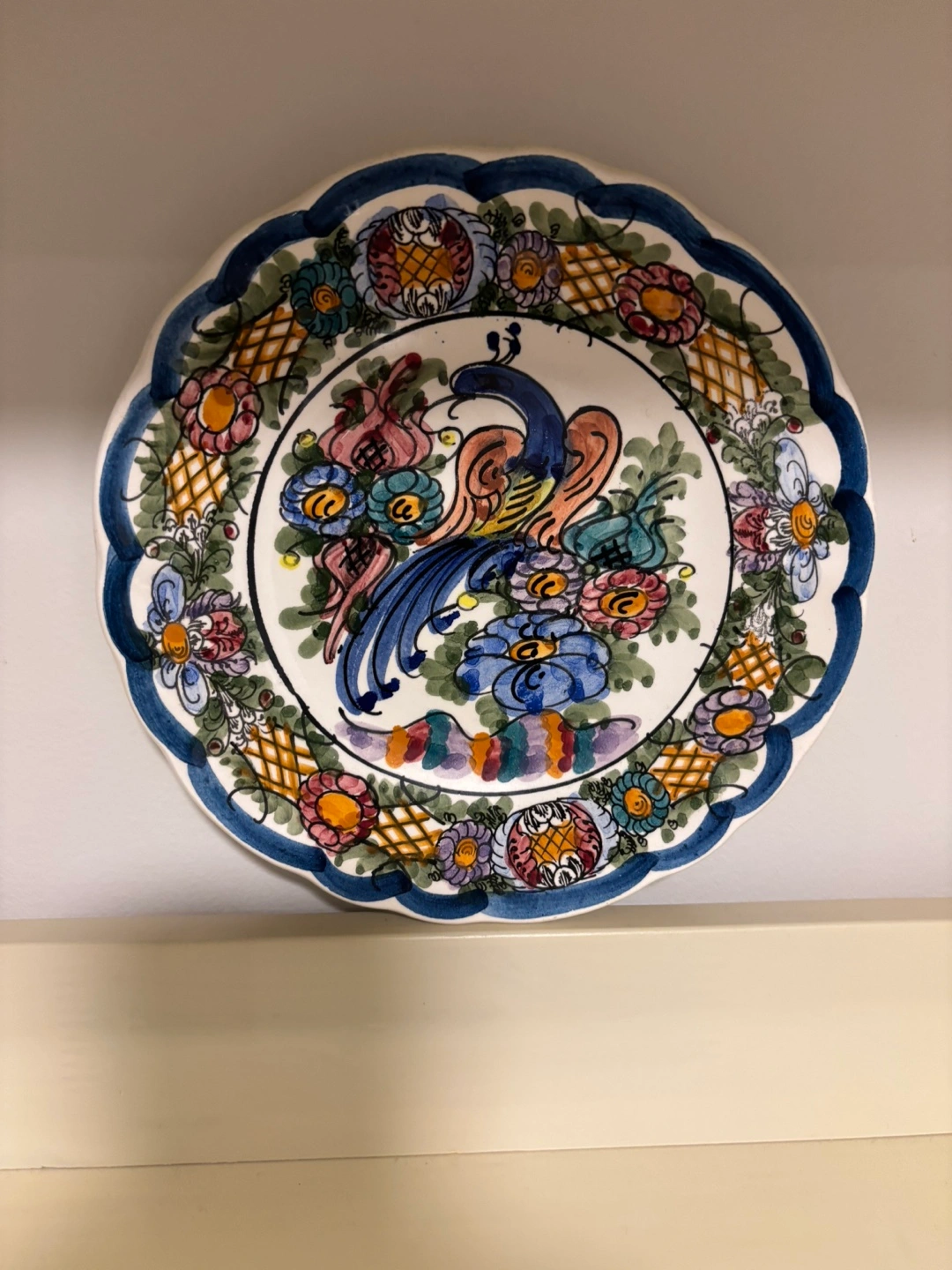 Hand-painted Greek ceramic plate featuring a peacock design. Measures approximately 8 inches in diameter. Excellent condition.