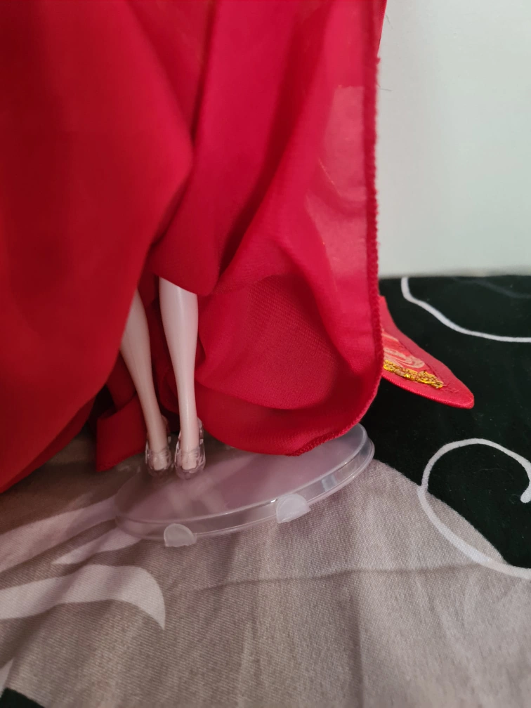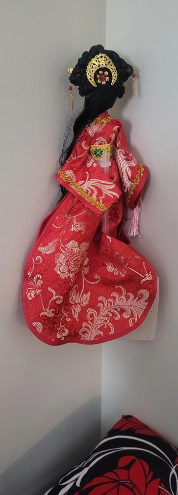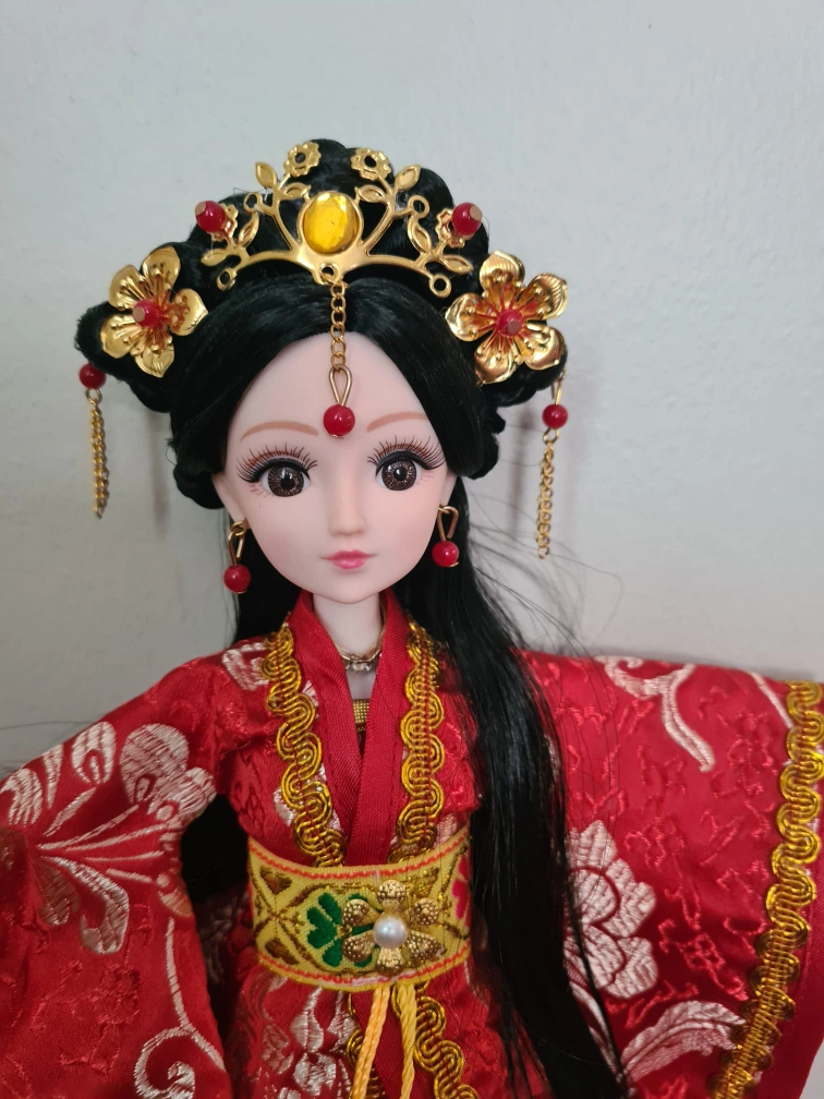 🌺This breathtaking Ming Dynasty inspired doll features a red and gold embroidered imperial robe, a 凤冠 (Fengguan) headdress, and a traditional round silk fan (团扇, Tuan Shan), embodying royal elegance. Her inset glass eyes and long, thick black hair enhance her lifelike beauty. Standing 30cm tall, she comes with all shown accessories, including shoes and a display stand.