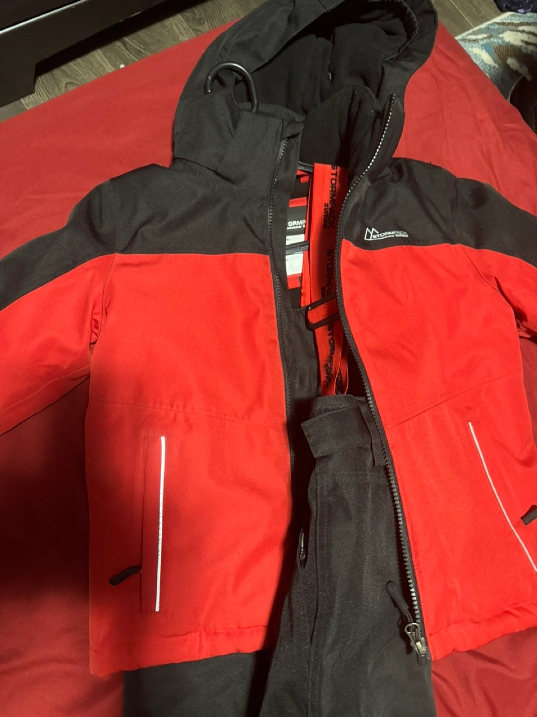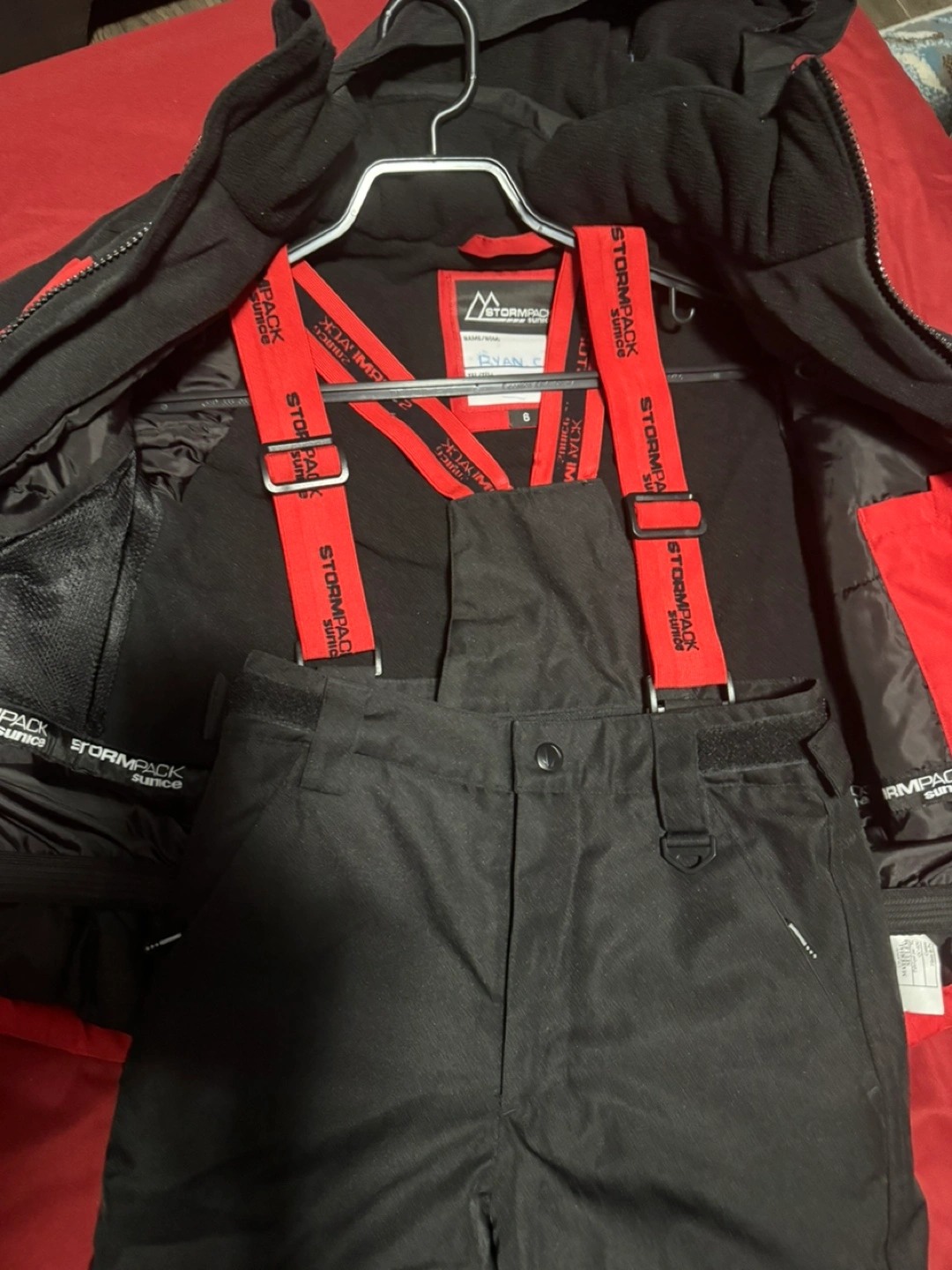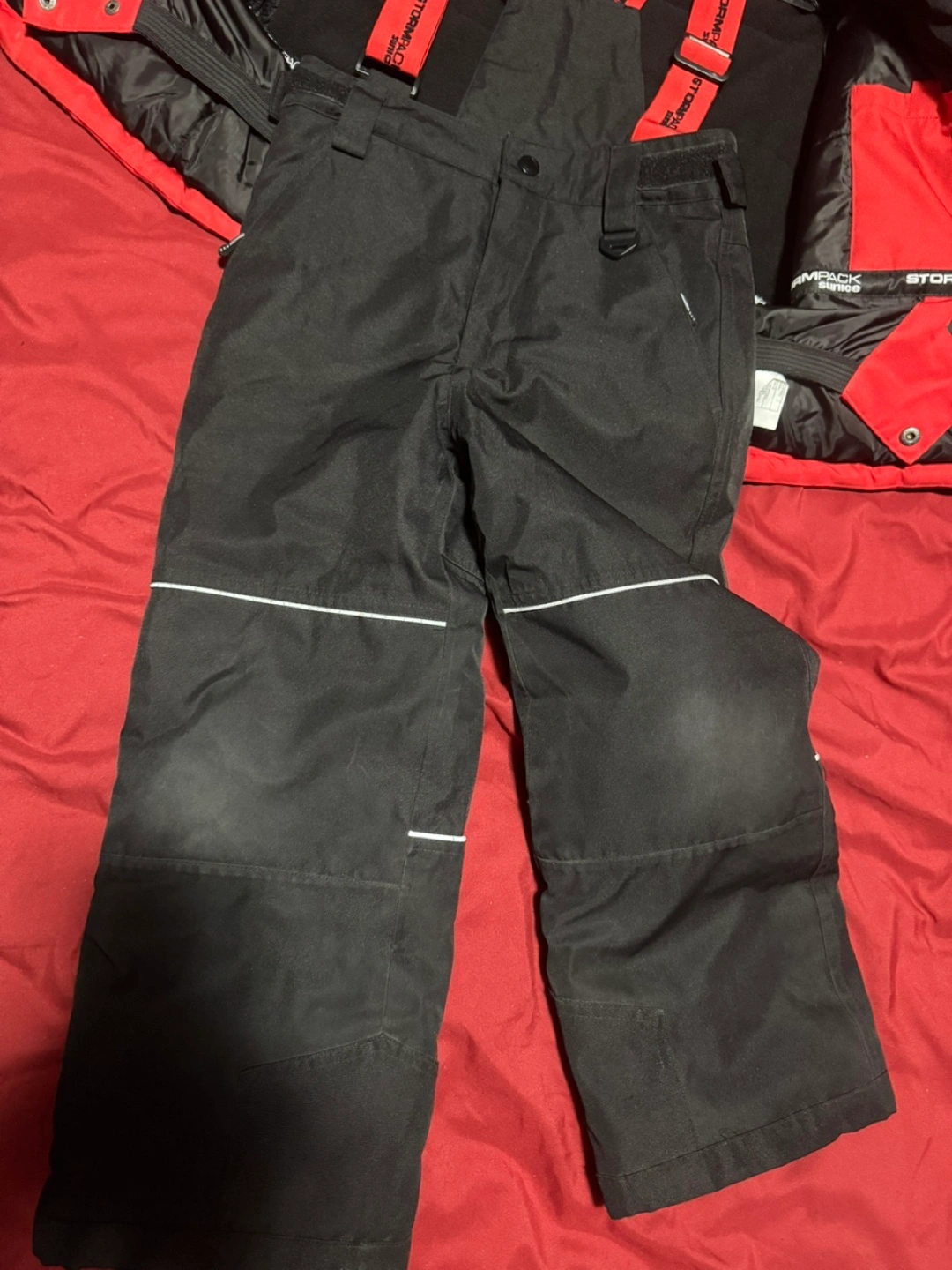 Black ski pants with red suspenders. Size 6. Waterproof and breathable.