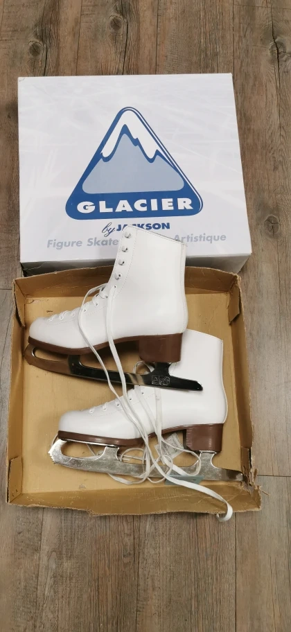 275White figure skates with brown base and metal blades. Comes in original box.size 8