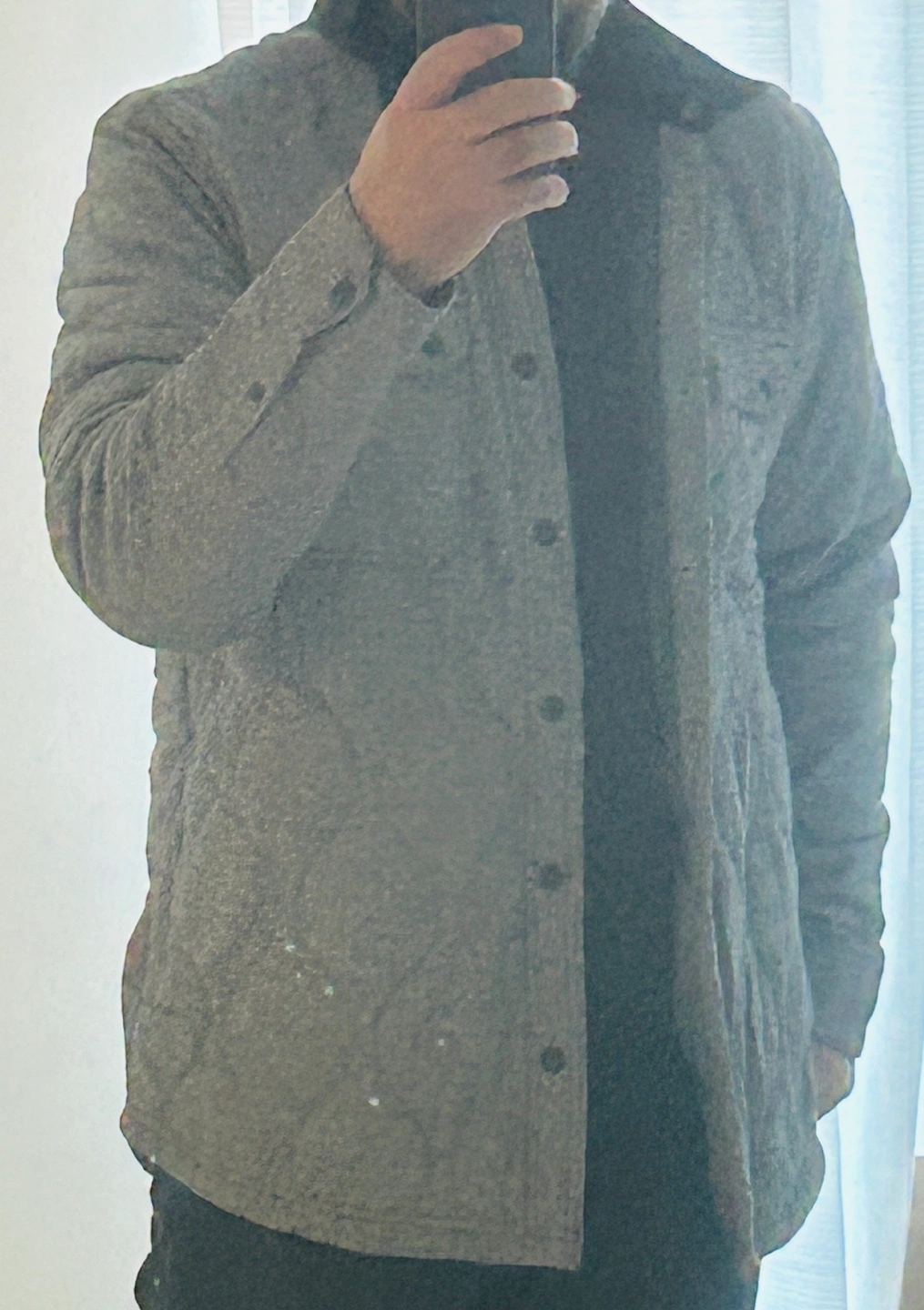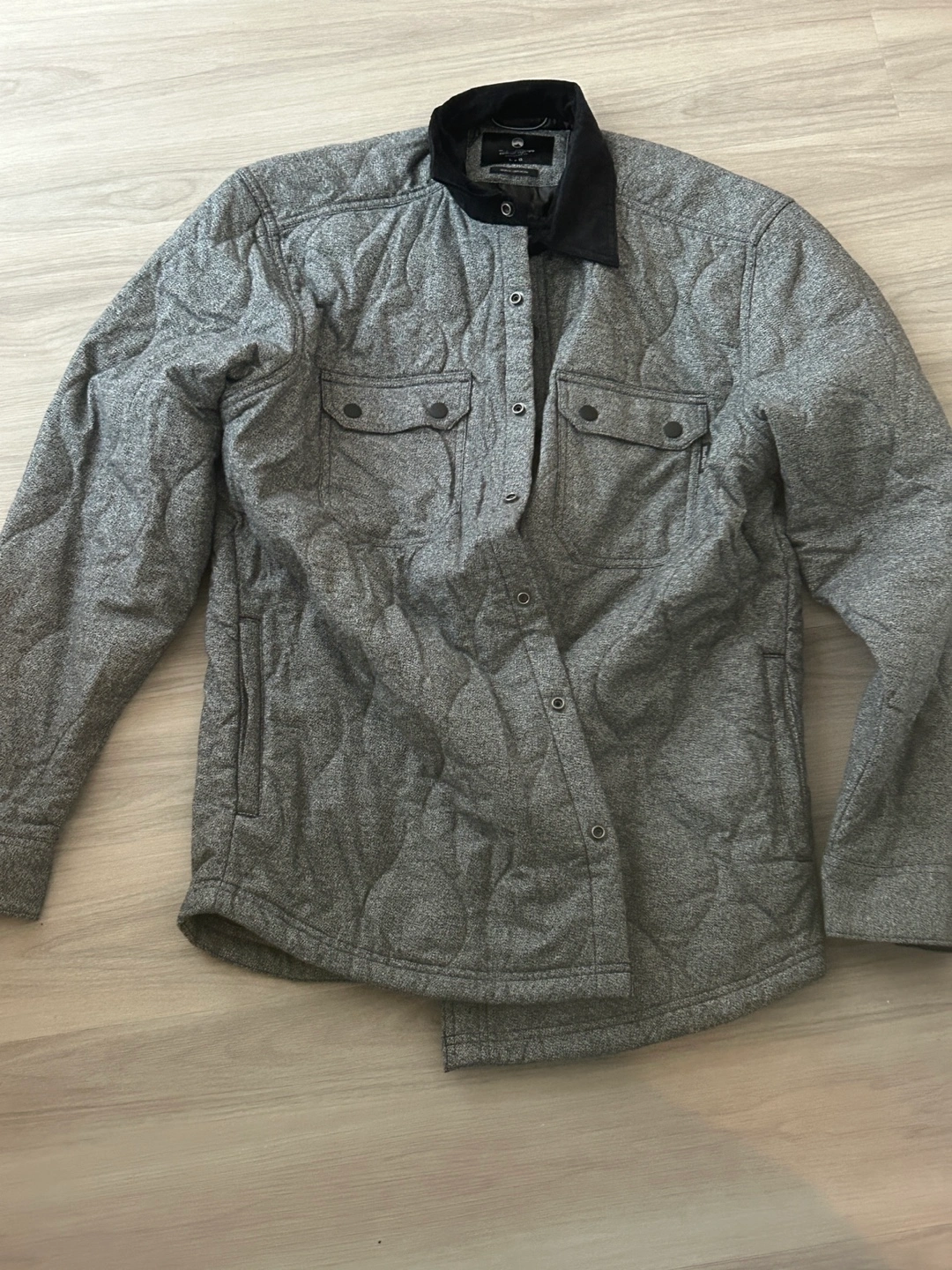Grey quilted jacket with a black collar. Long sleeves with button cuffs. Two chest pockets with button closures. Size L/G.
