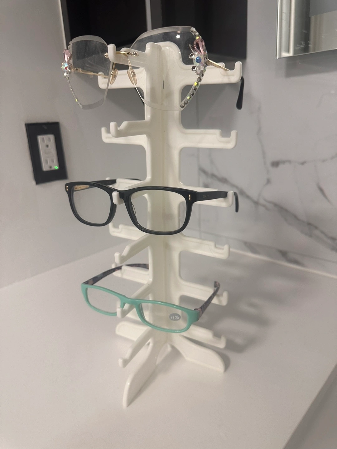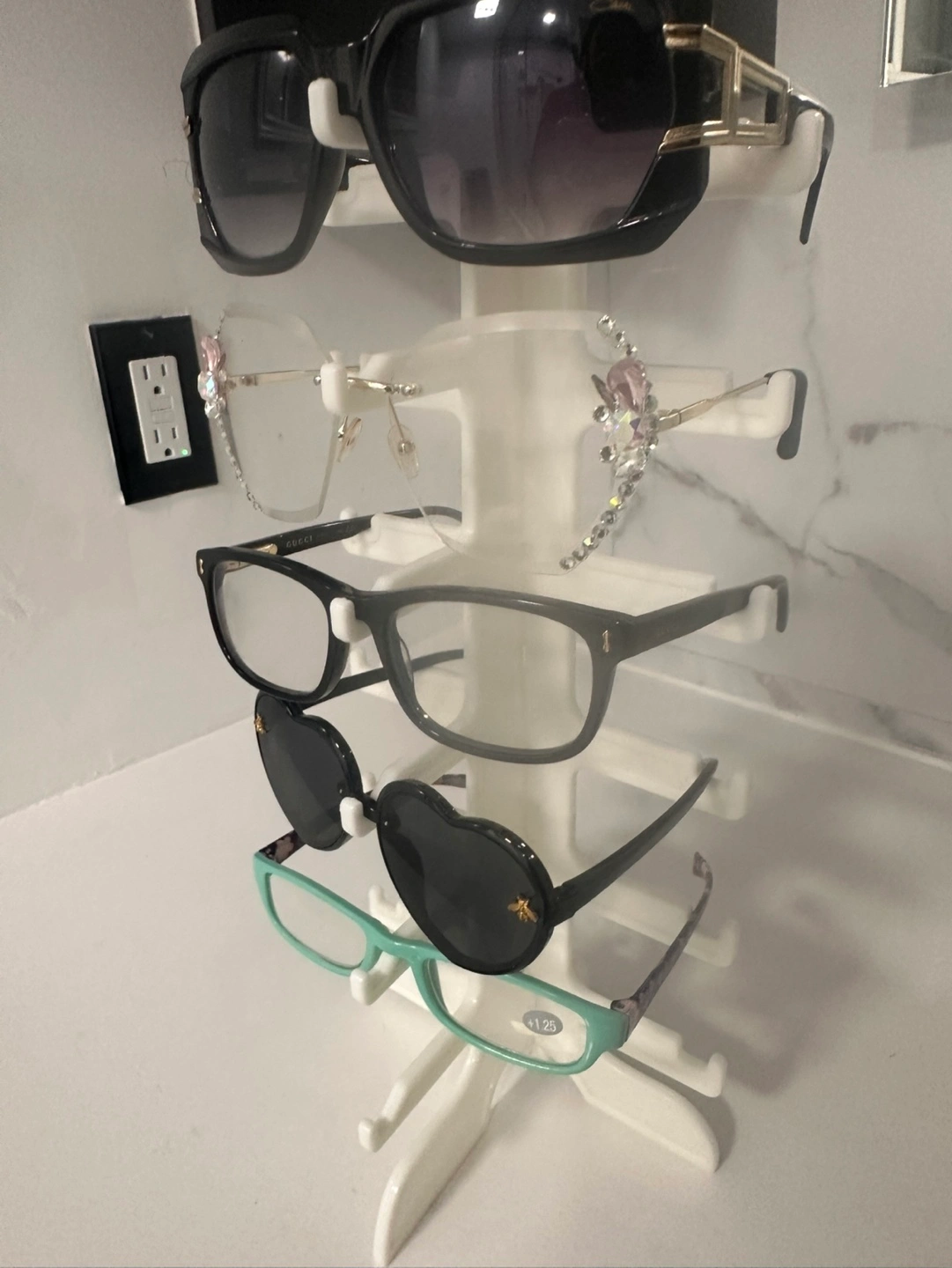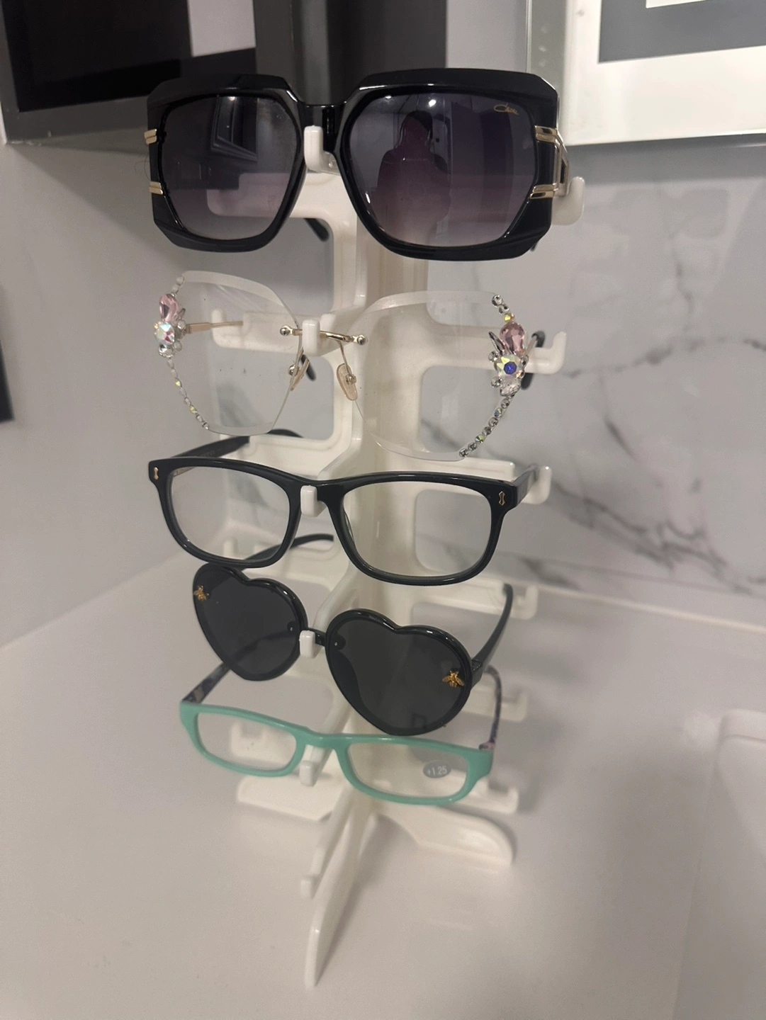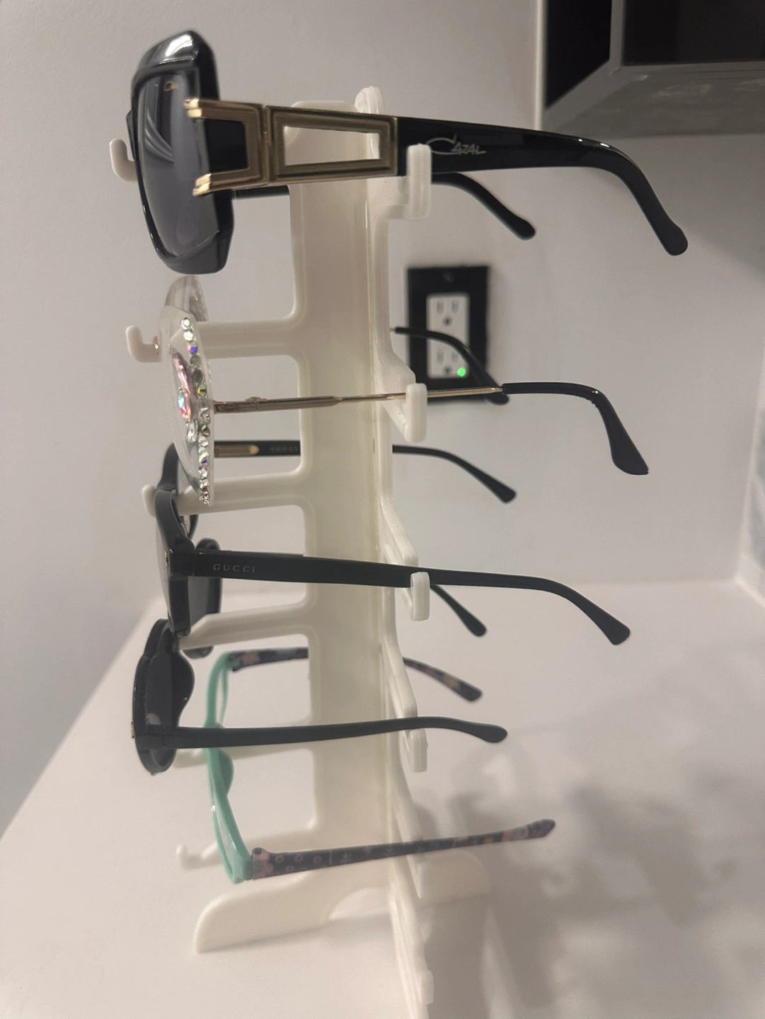 White Sunglasses stand, holds six pairs of sunglasses. Cash only please. Only available for pick up.