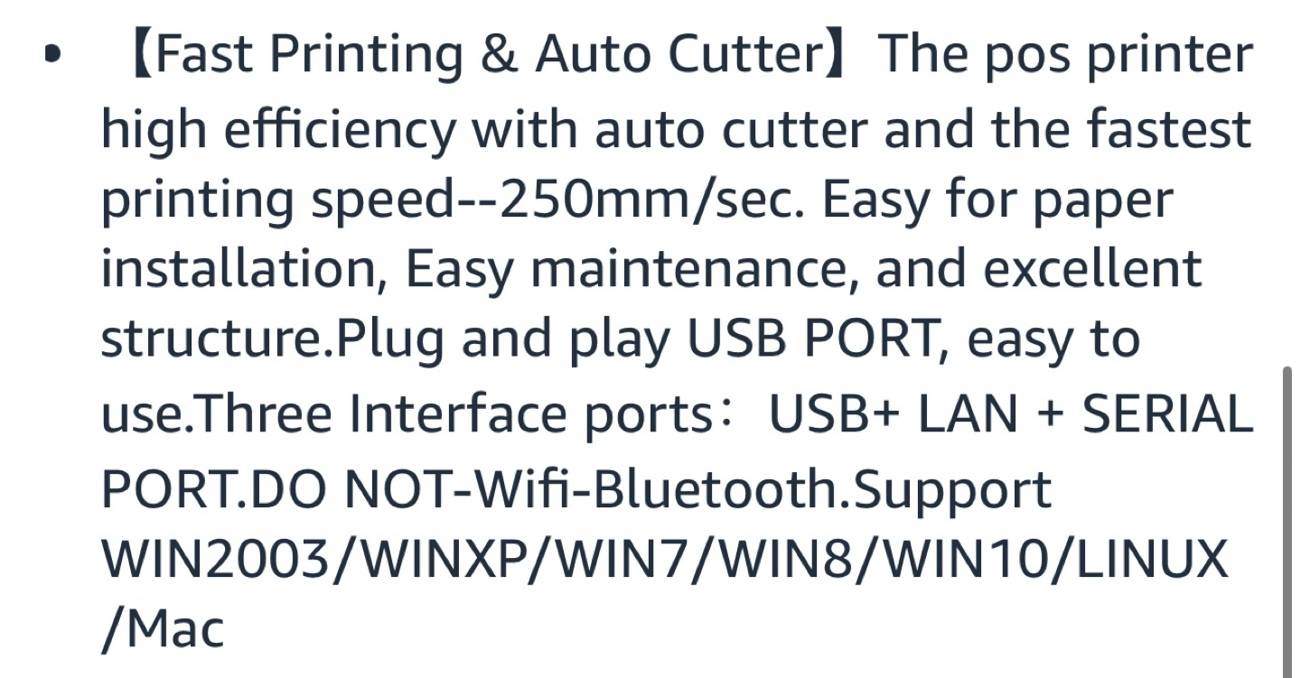 POS printer with auto cutter and fast printing speed. Supports cash drawer. Connects via USB, LAN, or Serial. Compatible with Windows, Mac, and Linux.