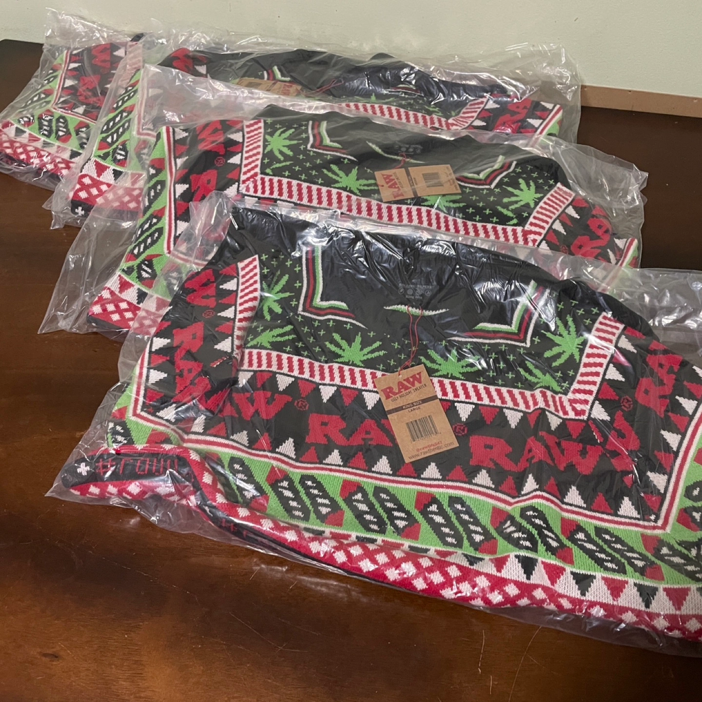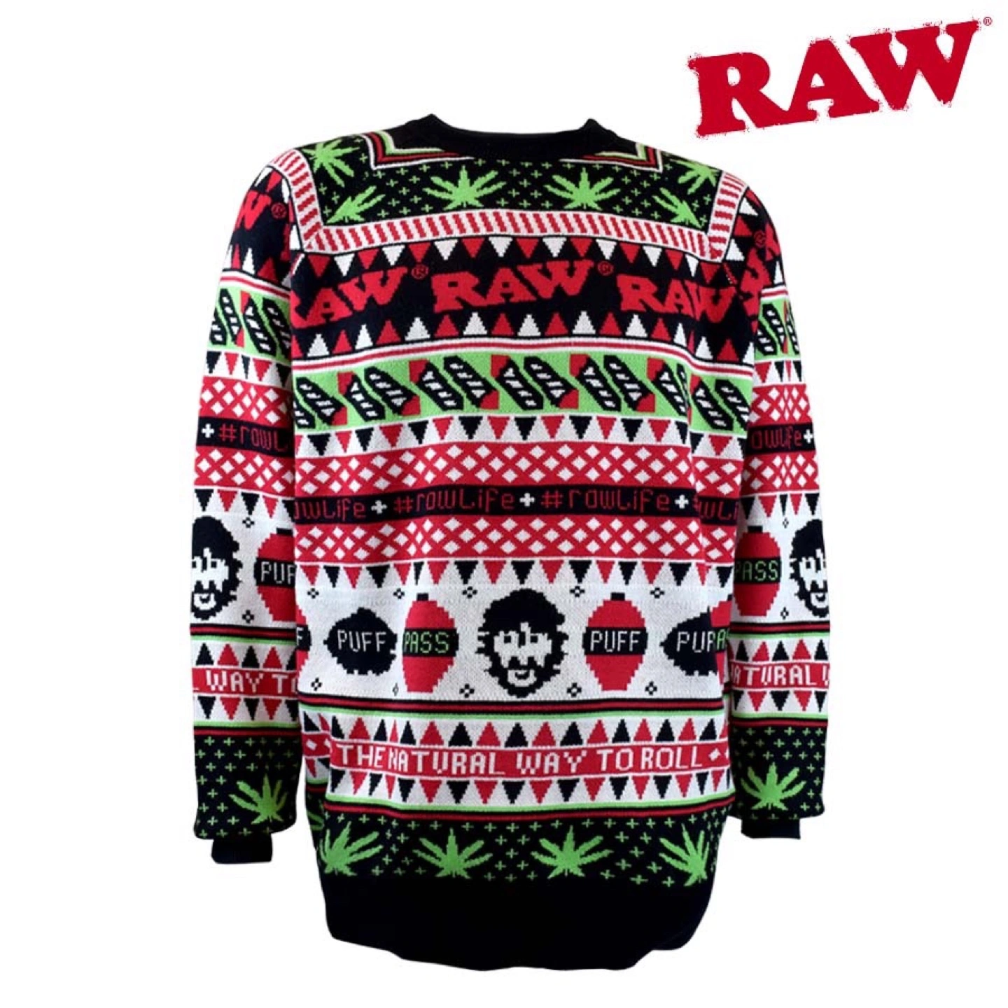 Limited edition RAW Holiday sweater is perfect for this year's Christmas party! The RAW Ugly Christmas Sweater features the iconic RAW logo, mini Josh faces, and puff, puff pass ornaments. This sweater is nice, soft, and warm. Fits true to size. Very limited quantity from 2021 drop.