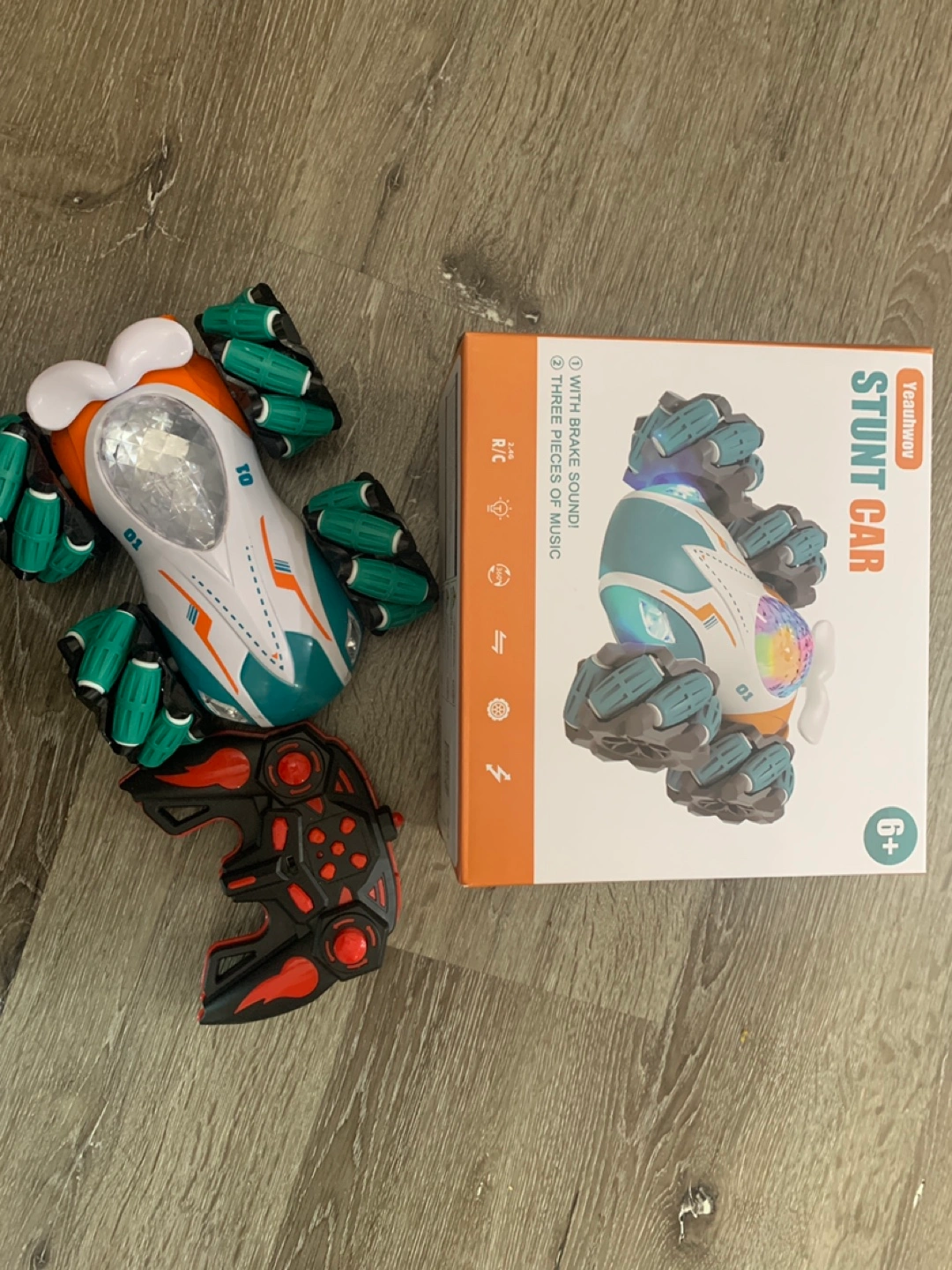 Remote control car with lights and music. Has six wheels and a rotating body. Comes with a remote control and box.