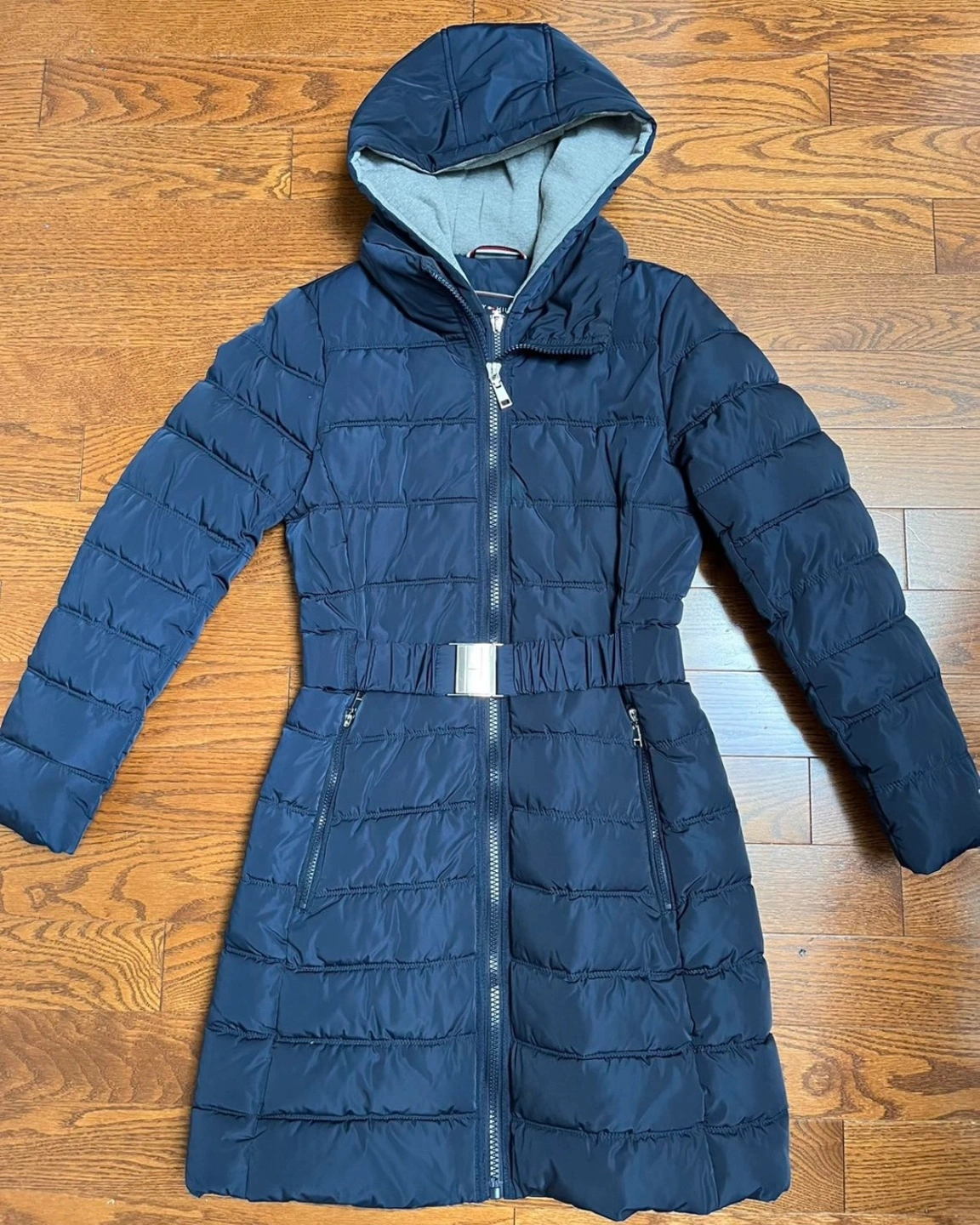 934Smoke free pet free home Pick up only- Yonge & Steeles Item brought to driveway Mint condition Navy XS Tommy Hilfiger Parka features - zippered hand pockets - flattering waistline with elastic belt - Knee length, snug fit - stylish yet functional - no large logos Retails over $200