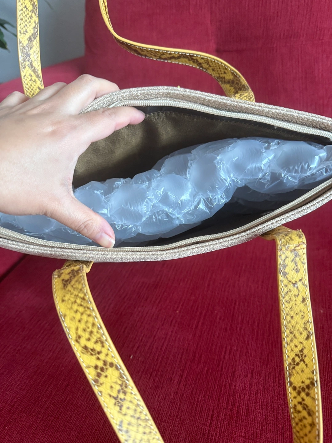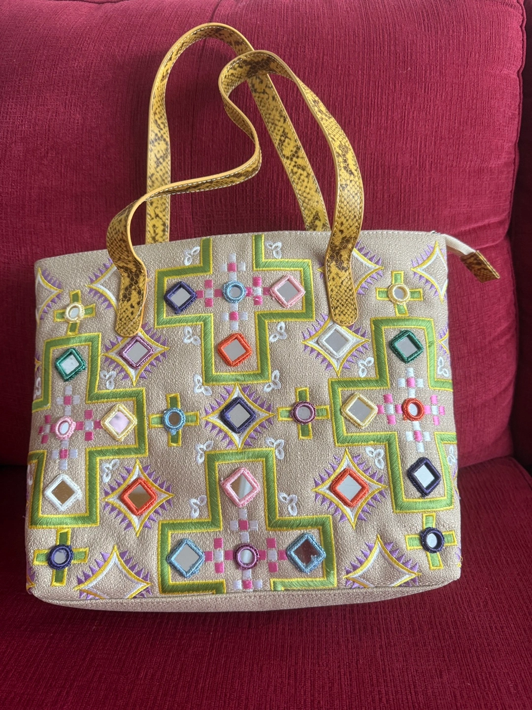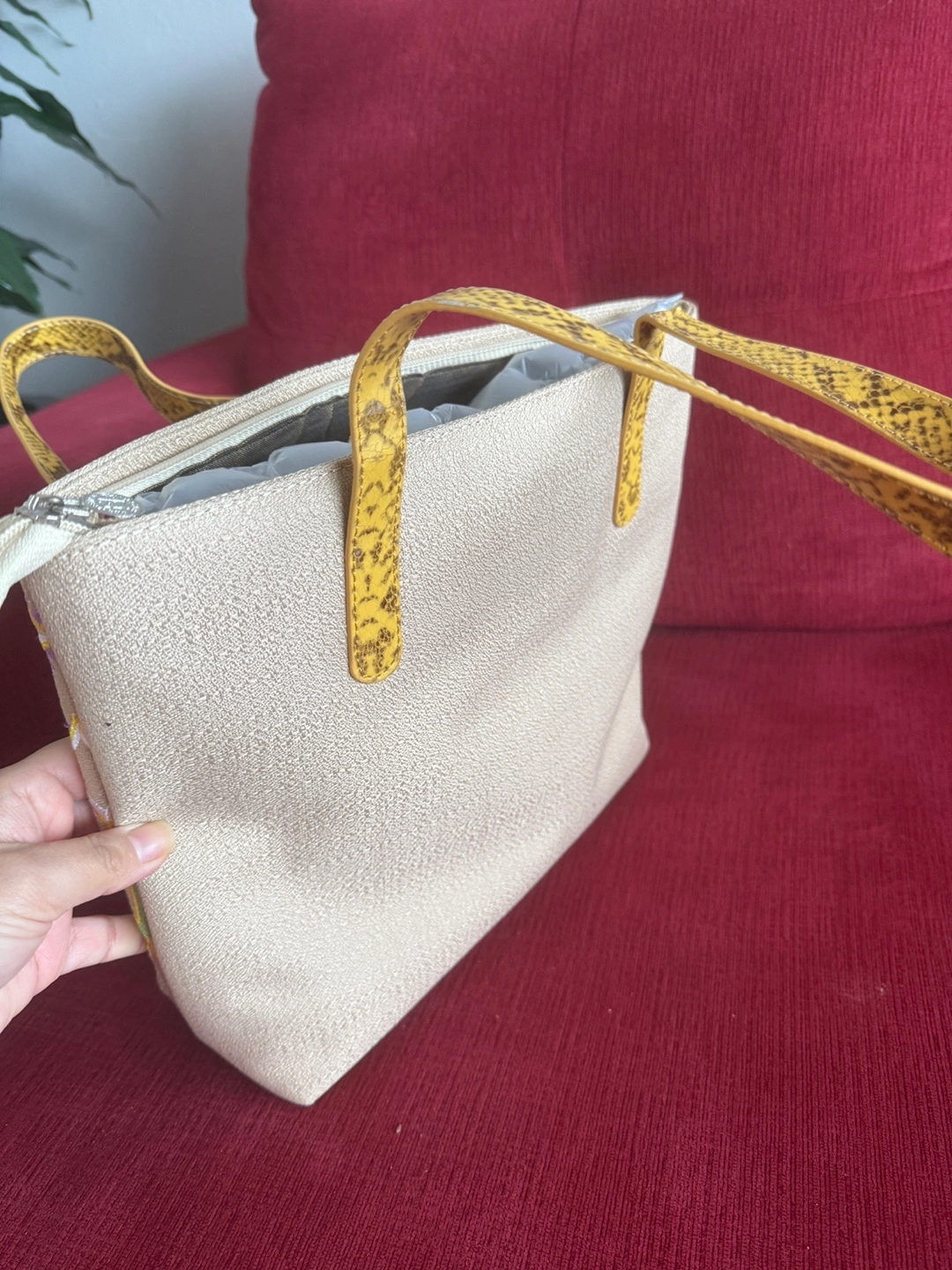 Beige canvas tote bag with yellow snake-skin patterned handles. Features a mirrored design on the front and a zipper closure. Interior is lined with fabric. Has a small interior pocket with a snap closure. Elevate your gift-giving this holiday season!!