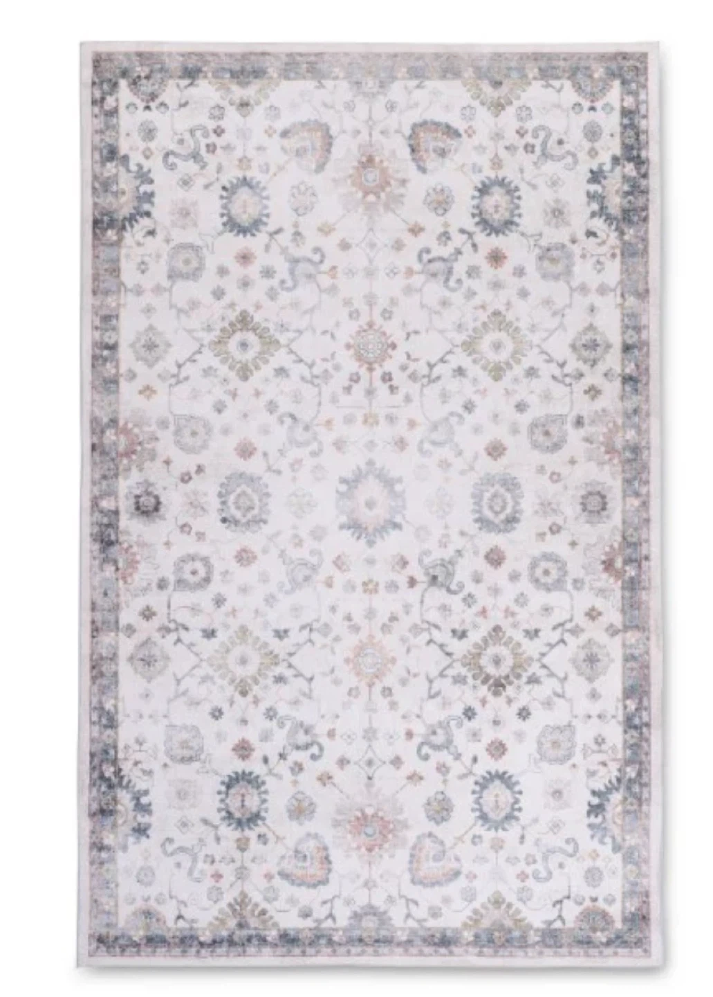 This is a stylish area rug with a traditional design. It features a cream base with intricate patterns in shades of blue, grey, and rust. The rug has a soft texture and a durable backing. Its classic look adds warmth and character to any room.