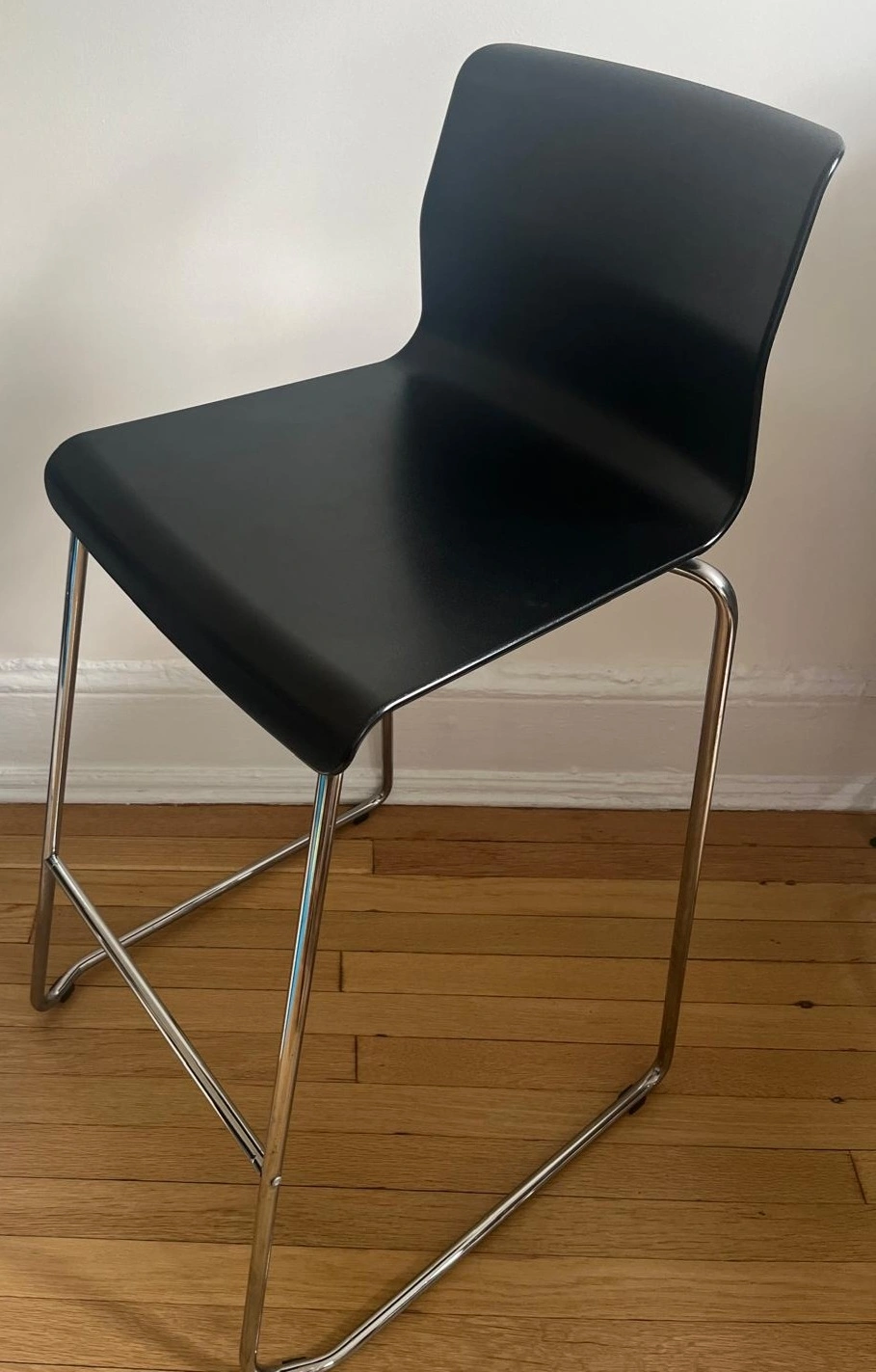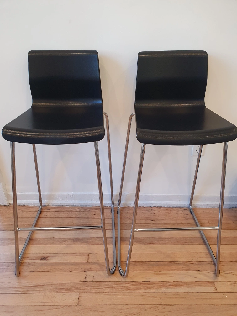 Selling two black and chrome Glenn bar stools, designed for Ikea by Marcus Arvonen. Great for a kitchen island or bar. The stools are stackable and have plastic floor protectors to prevent scratches.