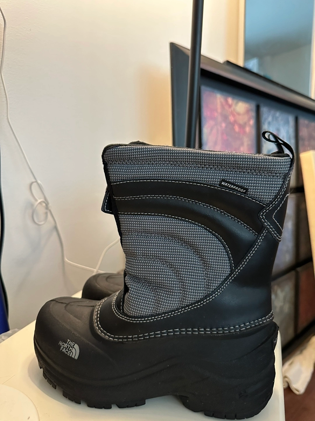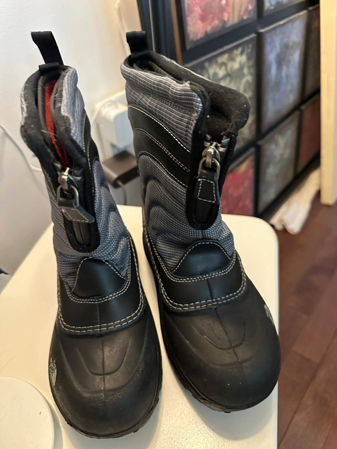 Black and grey snow boots with zipper closures. Waterproof. Condition is very good. Like New.