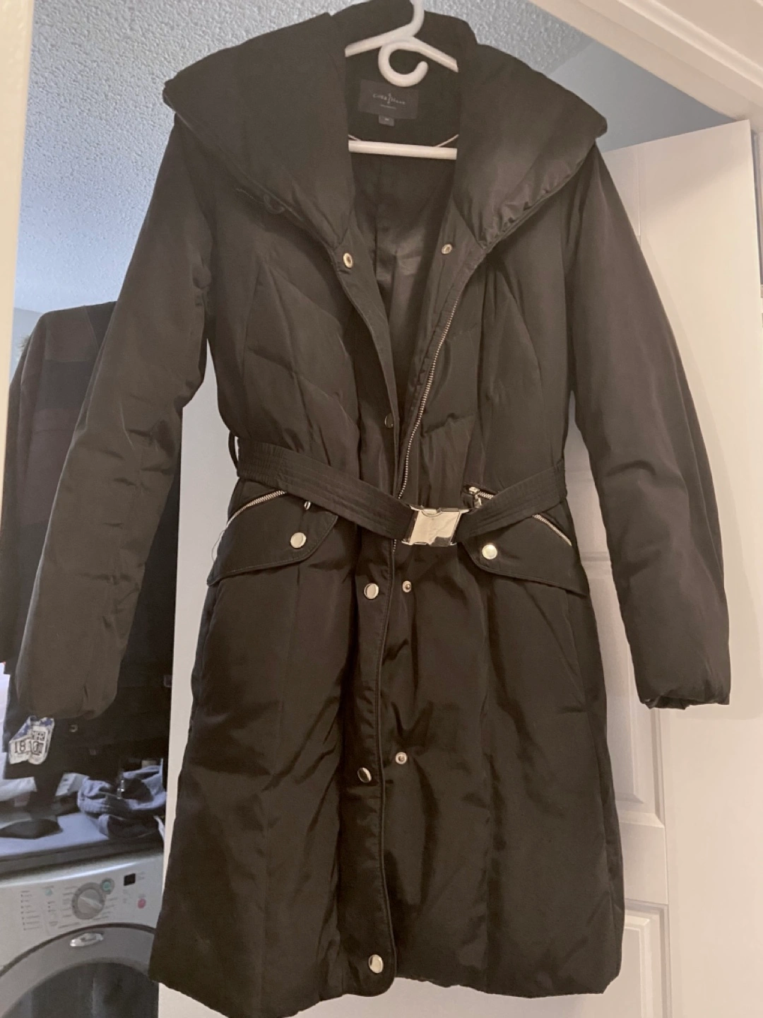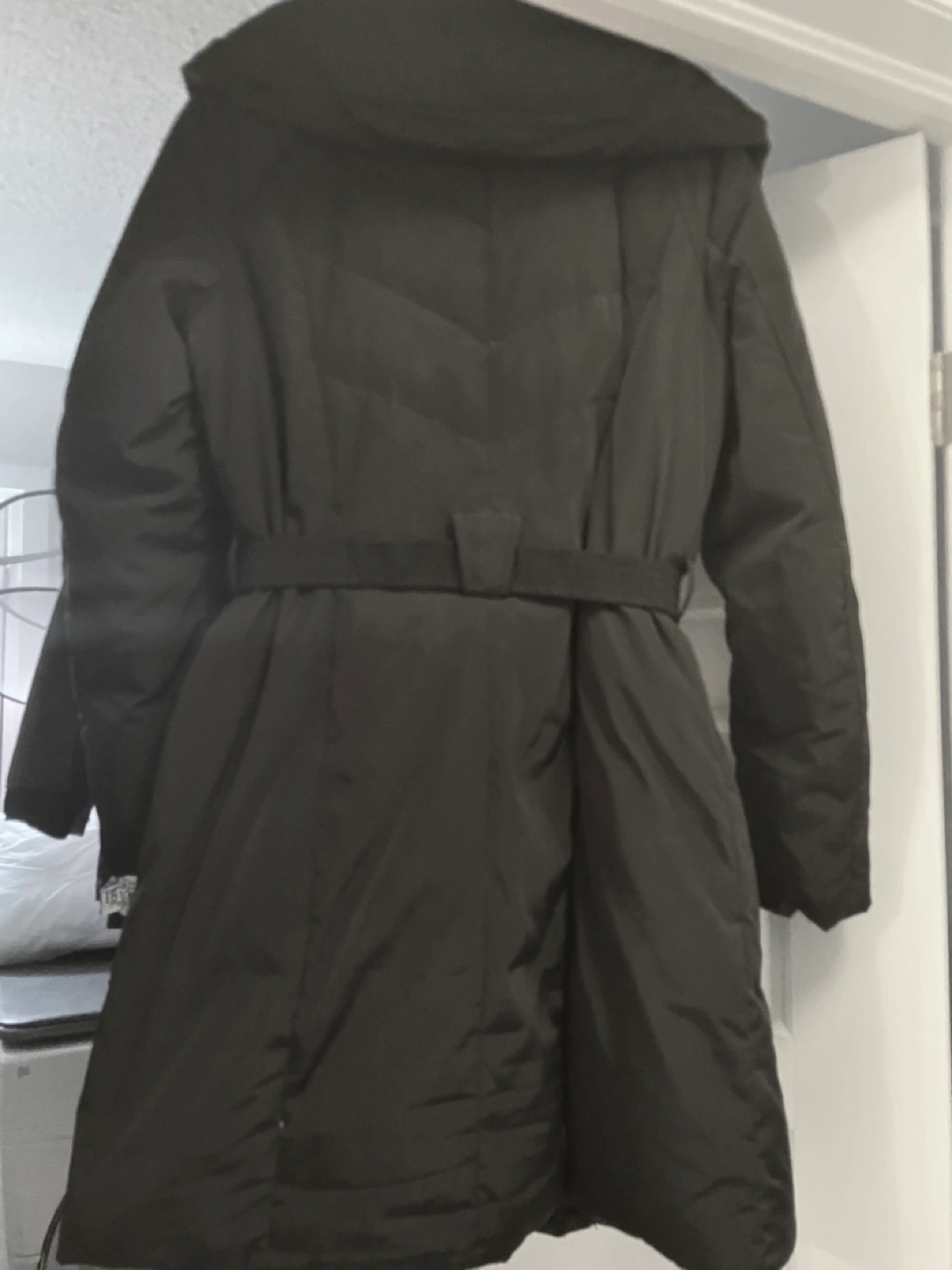 Black puffer coat with belt. Size Medium (fits sizes 10 - 12). Gold/brass accents. No hood. Pickup near Upper Middle and Guelph Line. Cash or e-transfer only.