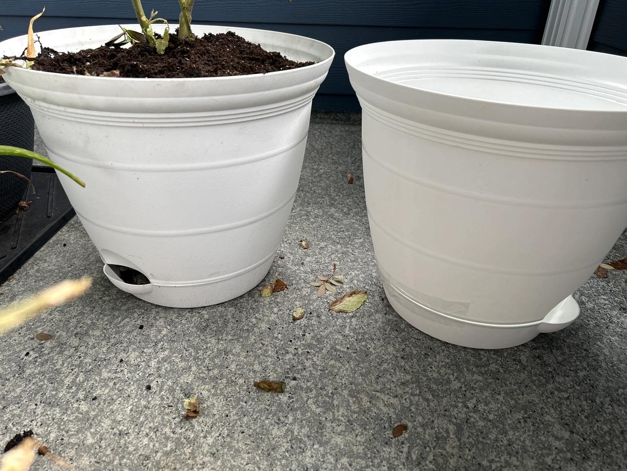 158Two white plastic plant pots. Drainage holes. Both pots are in good condition with no cracks or chips.
