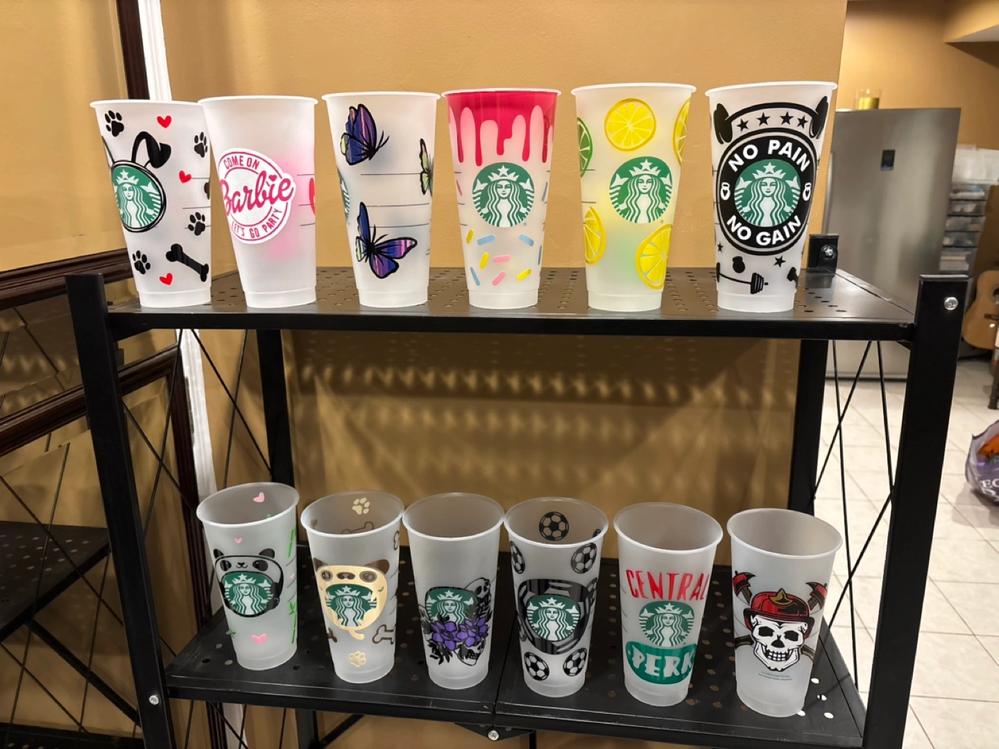 custom Starbucks cold cups with various designs. All cups are new and unused. Includes lids and straws. End of market sale selling for 15 each.