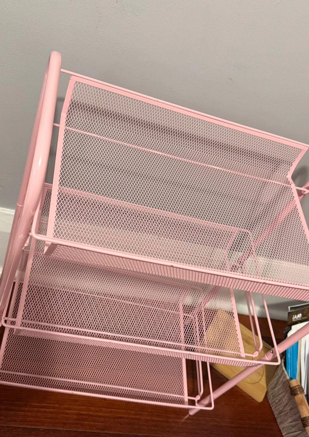 Three-tier rolling utility cart. Pink metal frame. Mesh wire shelves. Four wheels. Three S-hooks on the side. Easy to assemble.