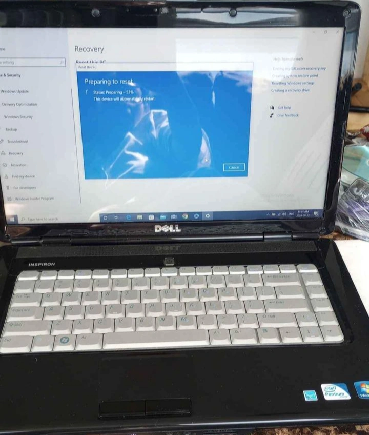 1000+Black Dell Inspiron laptop. It has a silver keyboard and a sticker that reads 'Intel Pentium'.