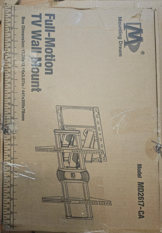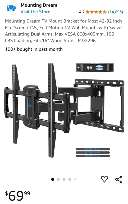 Full motion TV wall mount, swivel articulating dual arms, fits 16 inch wood studs. Max VESA 600x400mm, 100 LBS loading.
