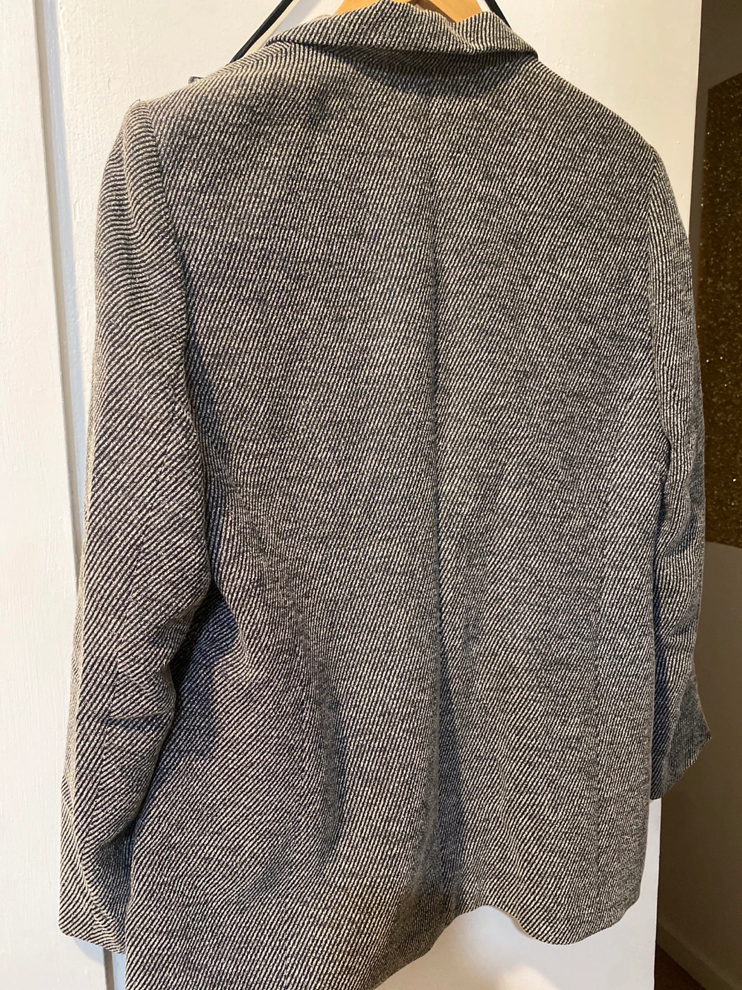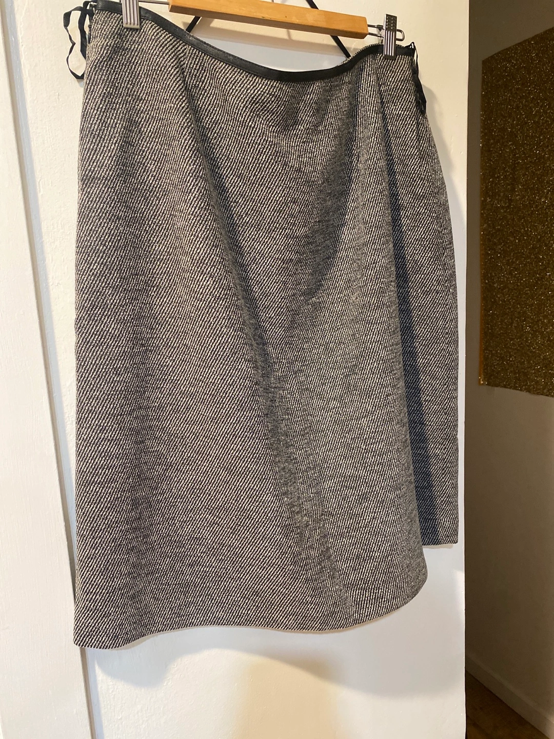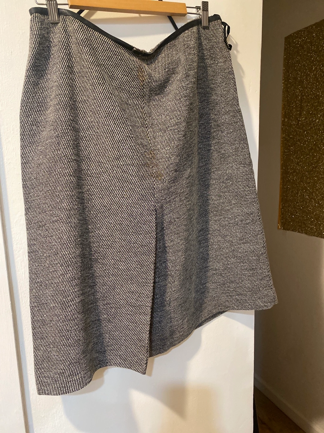 Black and white blazer and skirt set. Blazer has one button closure. Skirt has a black waistband. Both pieces are in good condition.