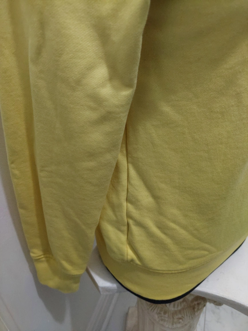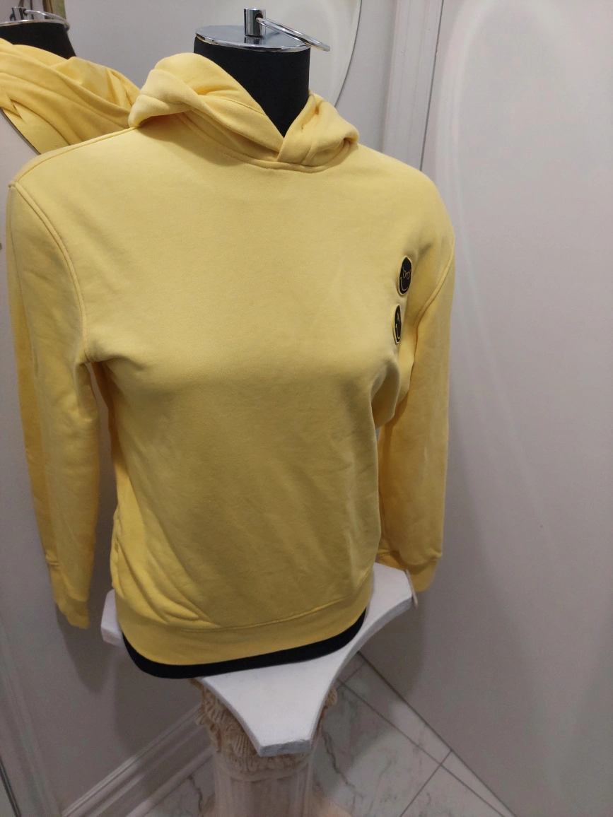 Yellow hoodie with a smiley face logo on the front. Long sleeves and a hood. Size medium.
