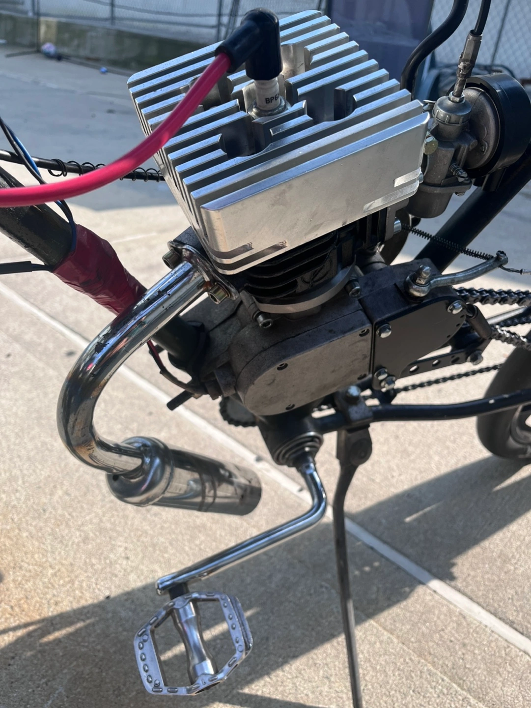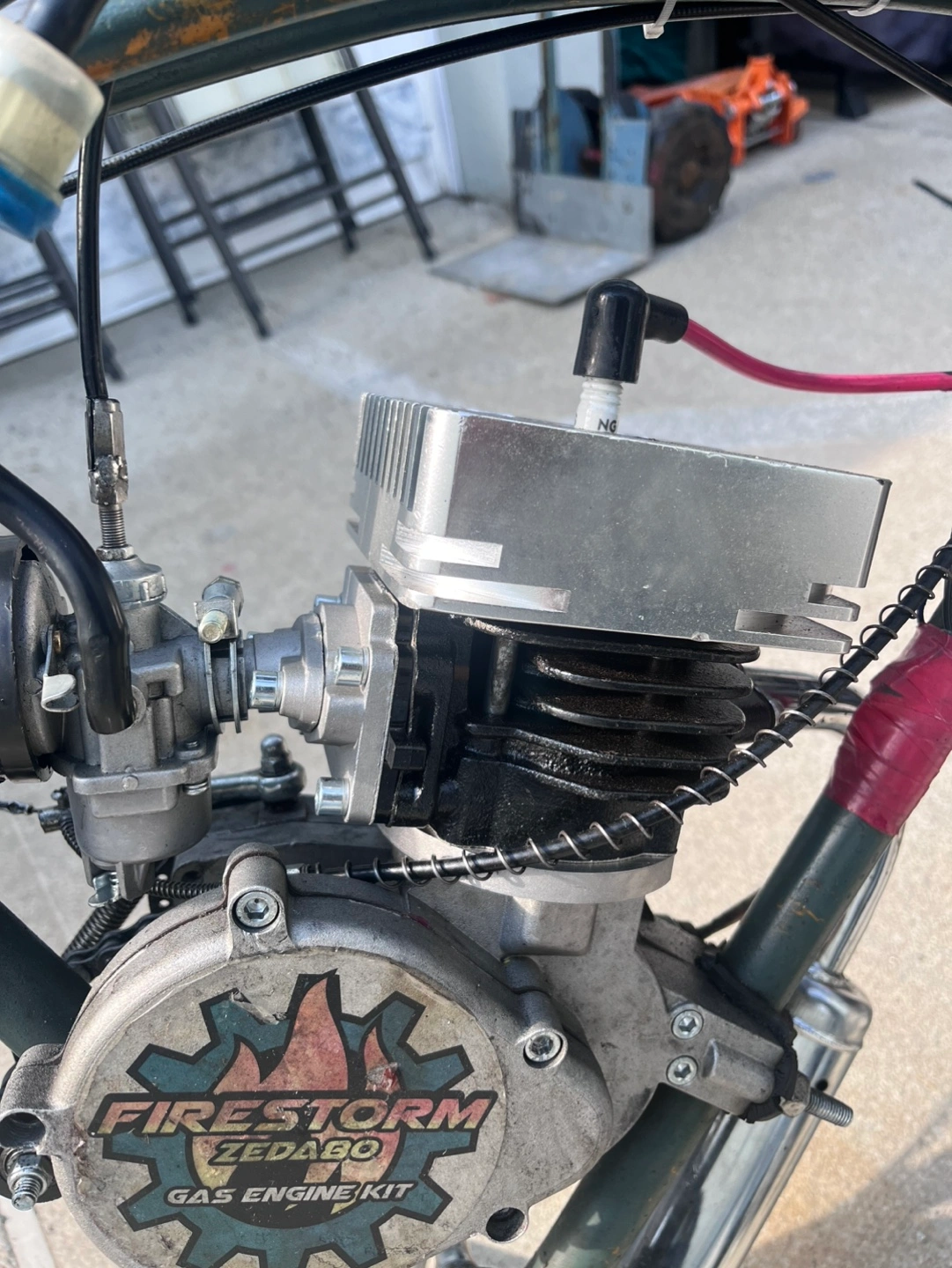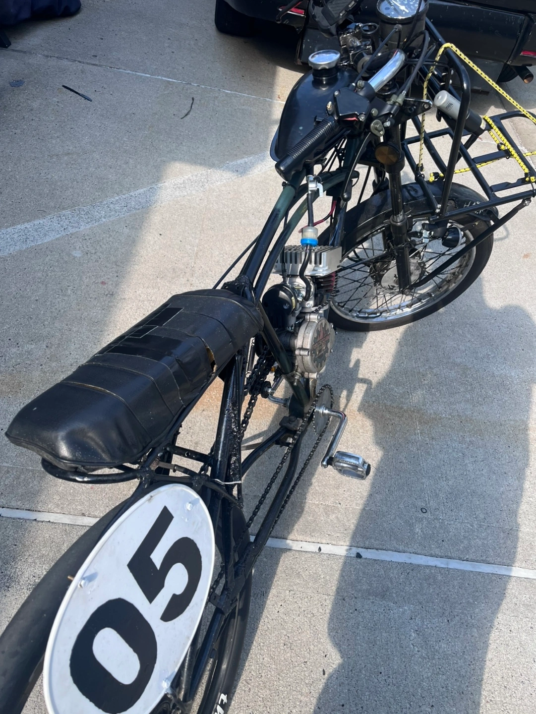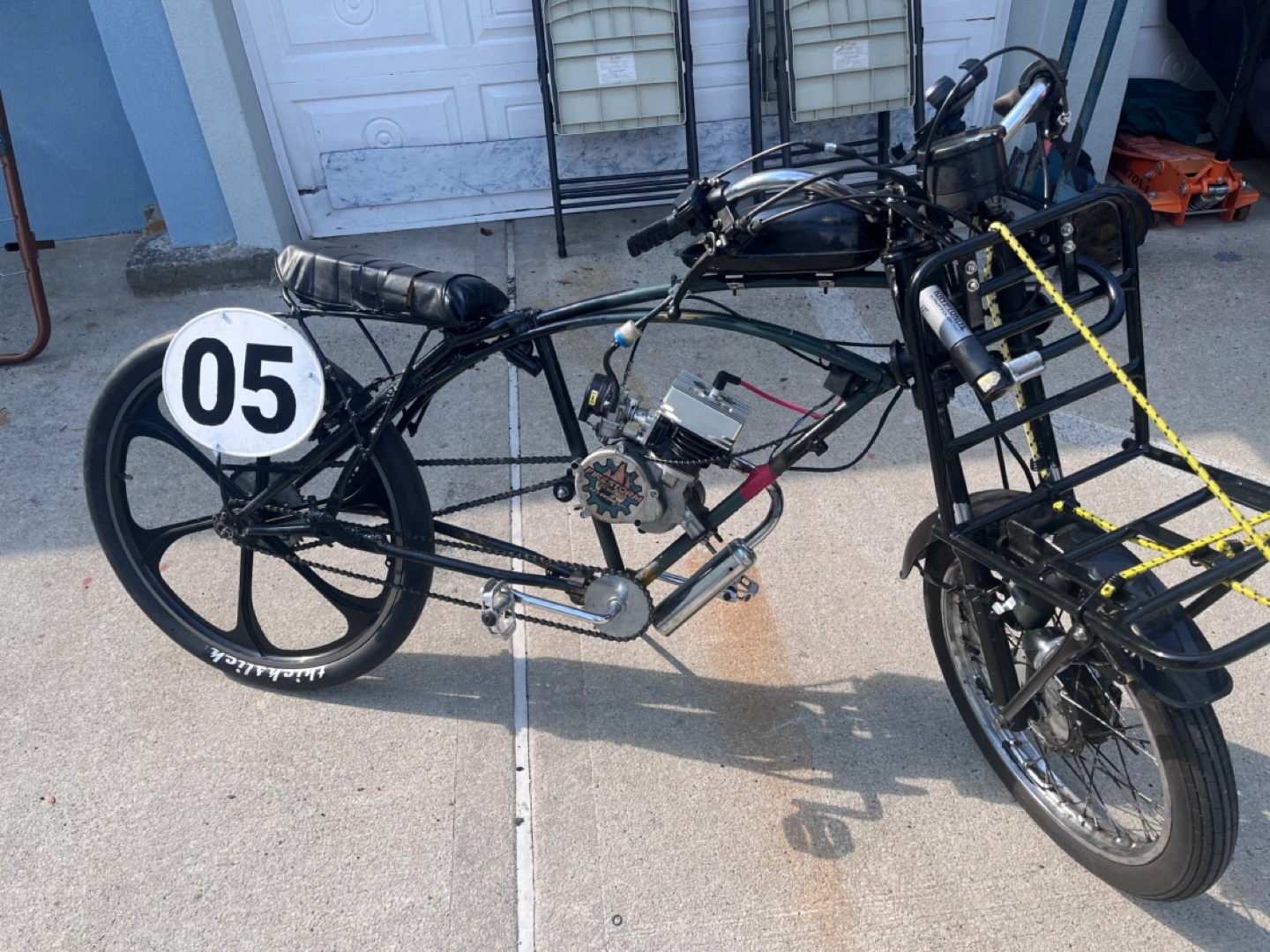Gas powered bicycle with a Firestorm Zeda engine. It has a minarelli cylinder with reed valve. Has a front rack and front non battery dynamo light. It’s built and tuned to perfection and has no problems. It comes with innumerable parts. It’s not like other builds that will leave you stranded. This thing is my daily and have never once broke down on me. Because of the minarelli cylinder and ported intake, this thing his very high speeds. Around 45-50 mph depending on your weight. This bicycle has a front fork, brake, and wheel off of a Honda trail 50. The seat is a custom made motorcycle seat, and the frame is stretched to give it that cage racer look. Price is firm, Please be fair, it’s a fully built bike, with a box full of parts. You won’t find another like it. Test drives with cash in hand. Trades welcome