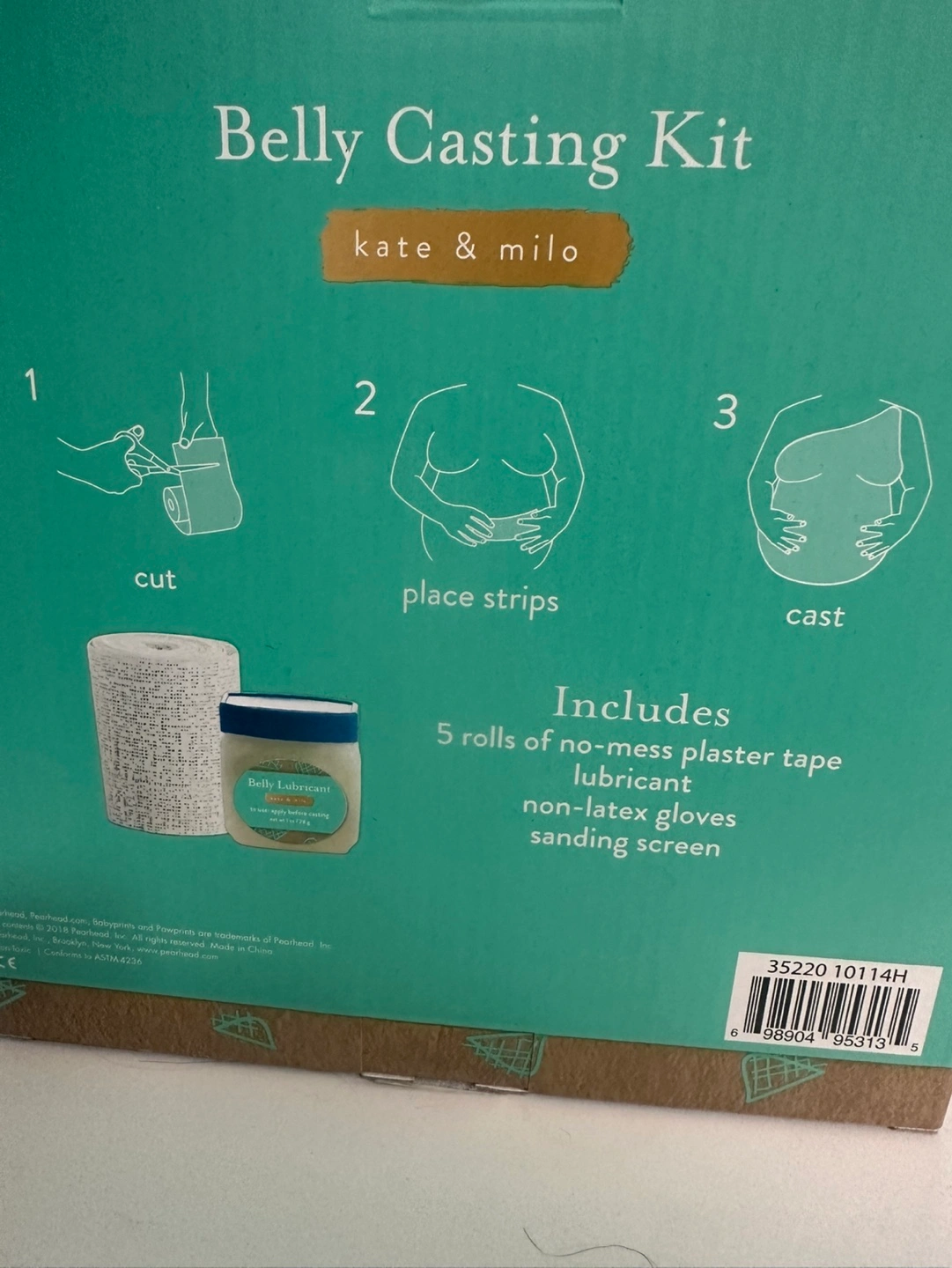 Belly casting kit, includes everything you need to create your own belly cast. Contains 5 rolls of plaster tape, lubricant, non-latex gloves and a sanding screen. Cash only please. Only available for pick up.