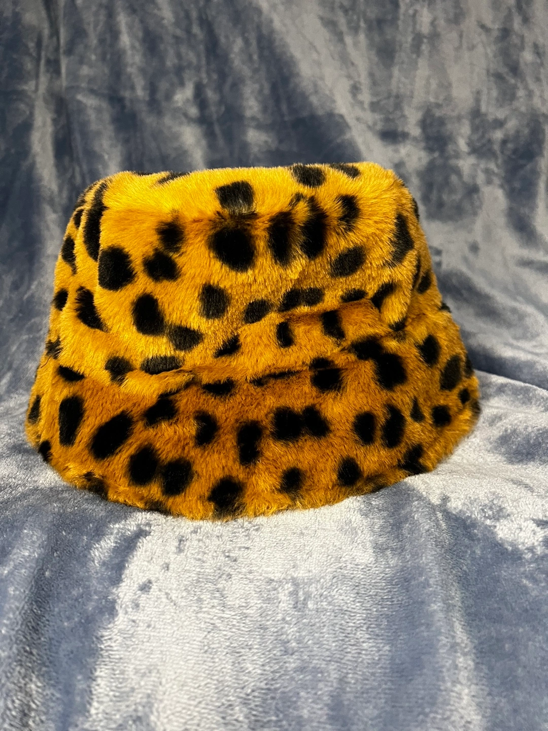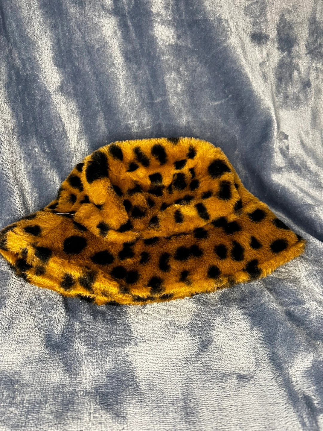 Fuzzy bucket hat with leopard print. One size fits most.