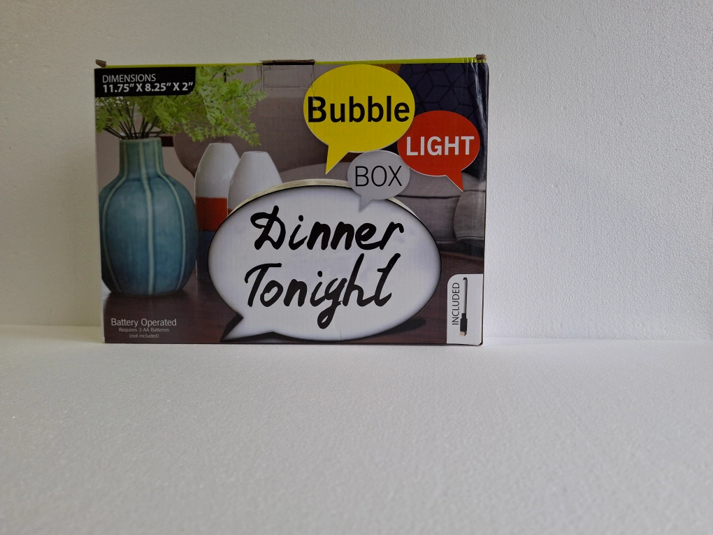 Write messages that no one will miss with this fun Bubble Light Box Message Board featuring a speech bubble-shaped light box with a smooth dry erase surface. Box has hang holes on back for easy wall mounting. Includes 1 black dry erase marker with an eraser cap. Measures approximately 11.75" x 8.25" x 2". Requires 3 'AA' batteries (not included). Box measures approximately 12.5" x 2.25" x 9".
